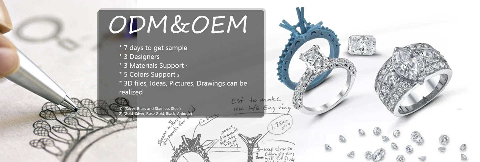Only U Jewelry mainly offer custom services. There are 3 designers with us. We can realize your designs in 3 - 5 days from an idea or draft.