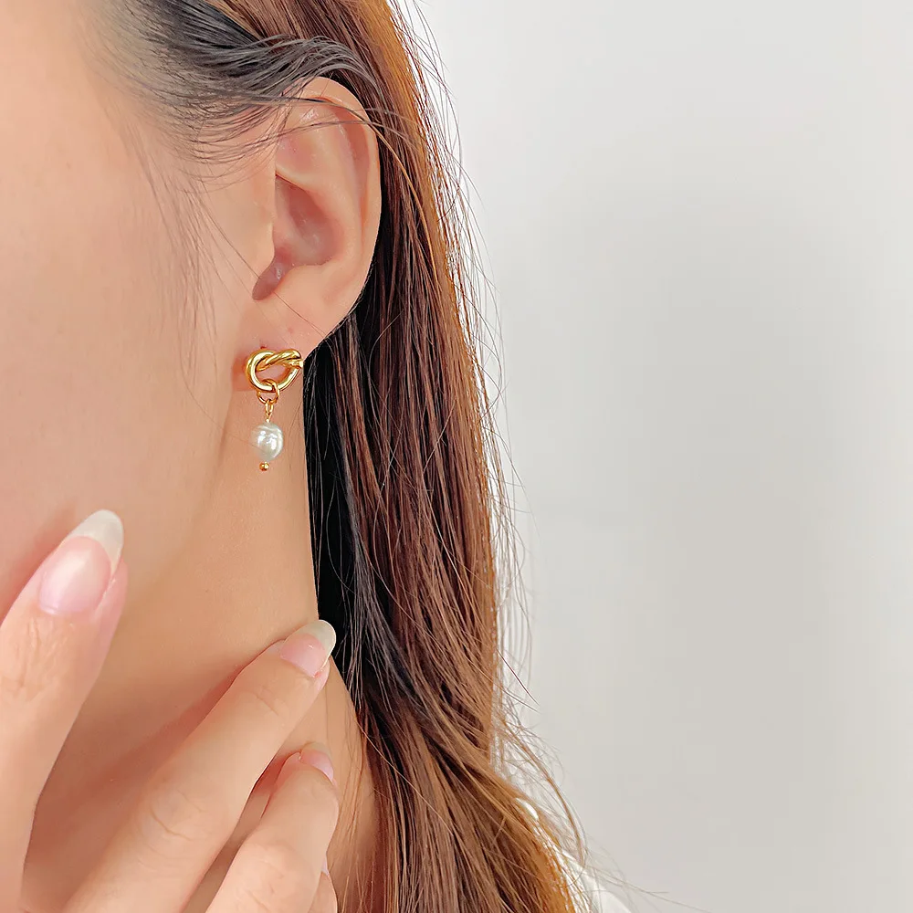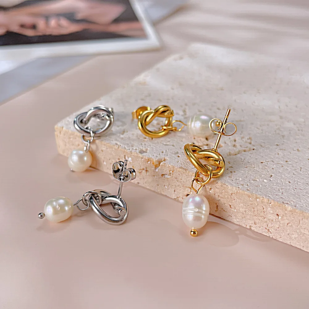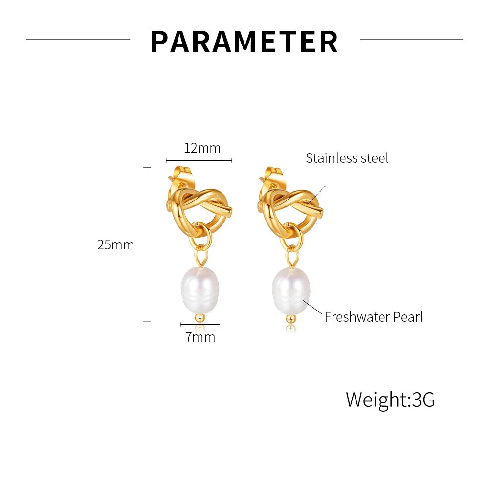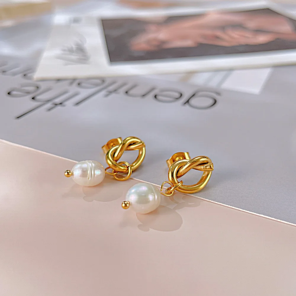 Product Name | Ouj Wedding Accessories 18K Gold Plated Titanium Steel Bridal Knot Natural Freshwater Pearl Dangle Pendant Stud Earrings |