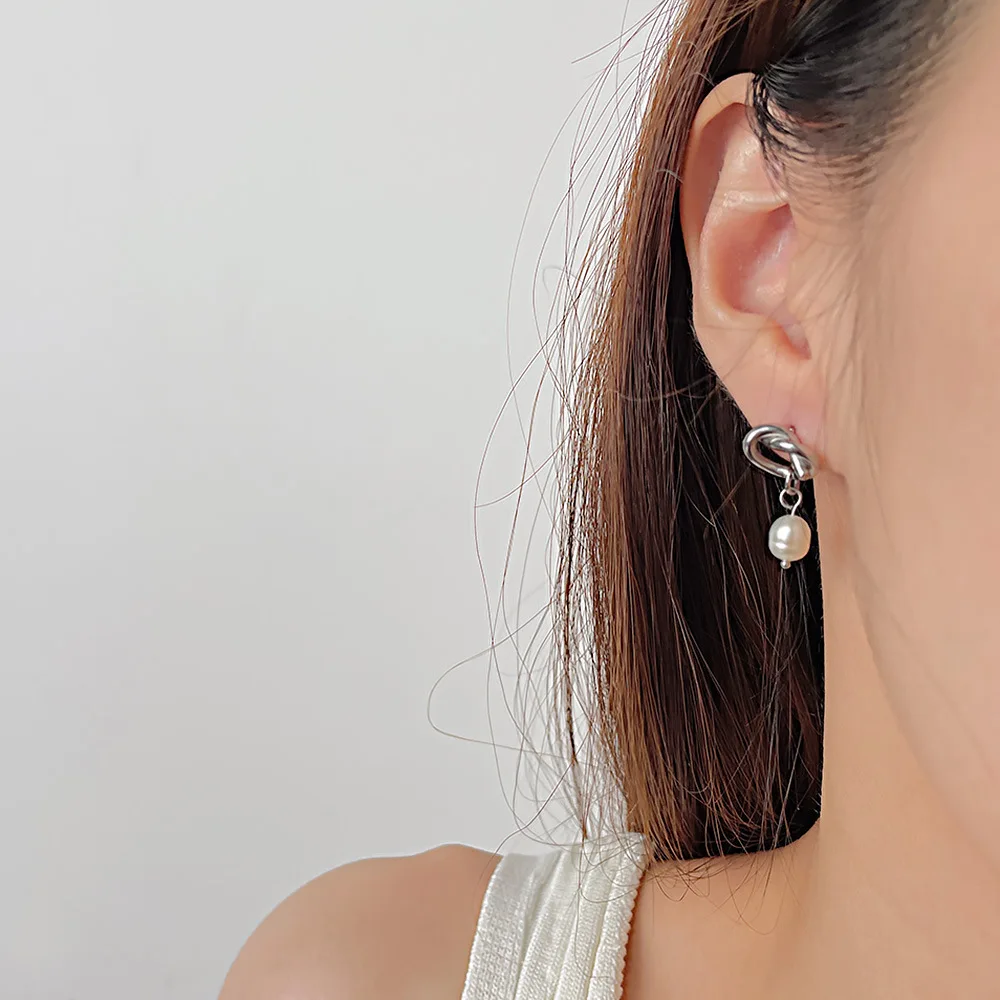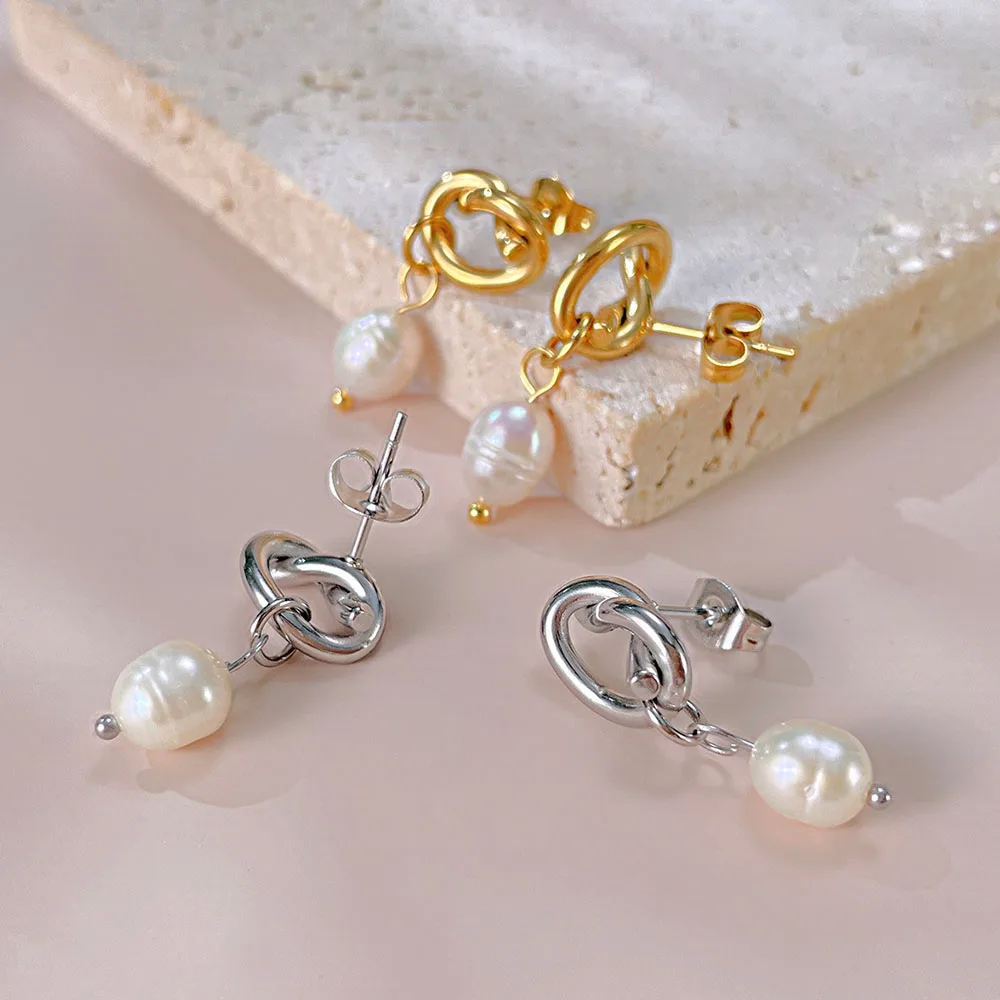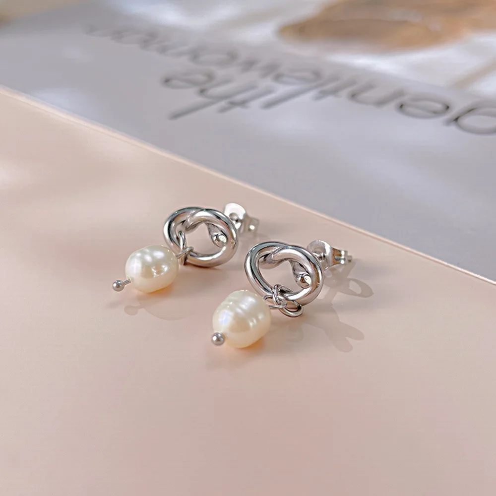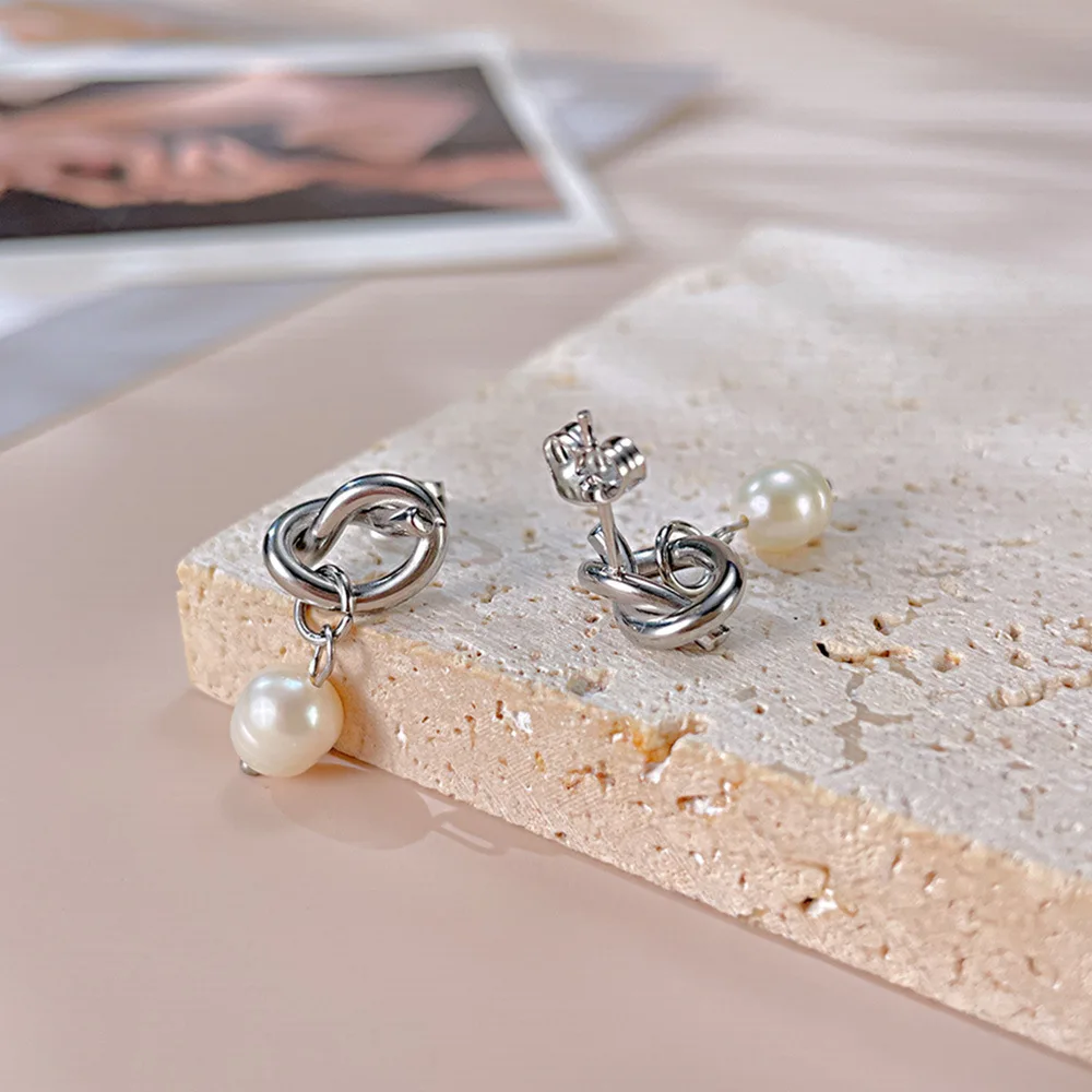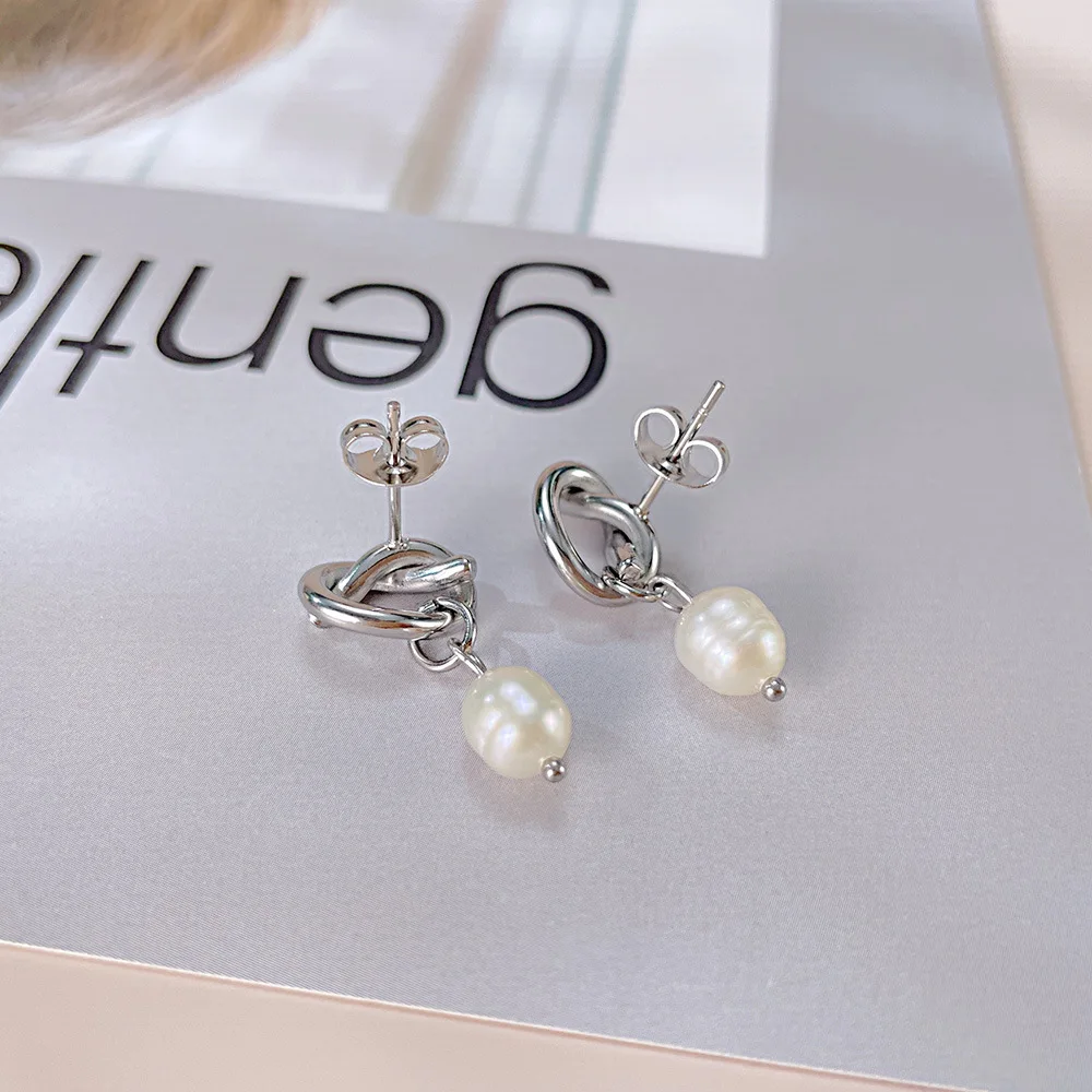 Product Name | Ouj Wedding Accessories 18K Gold Plated Titanium Steel Bridal Knot Natural Freshwater Pearl Dangle Pendant Stud Earrings |