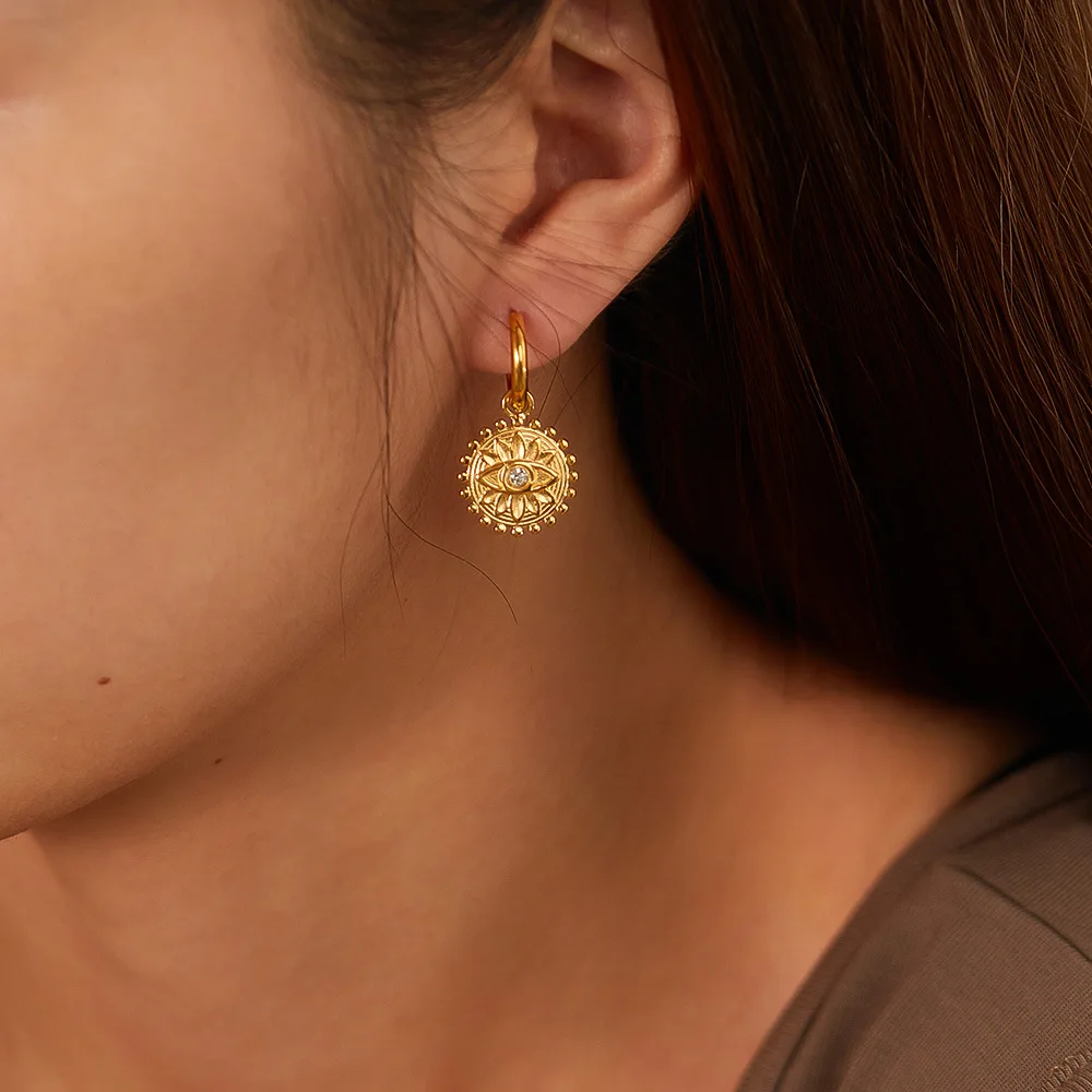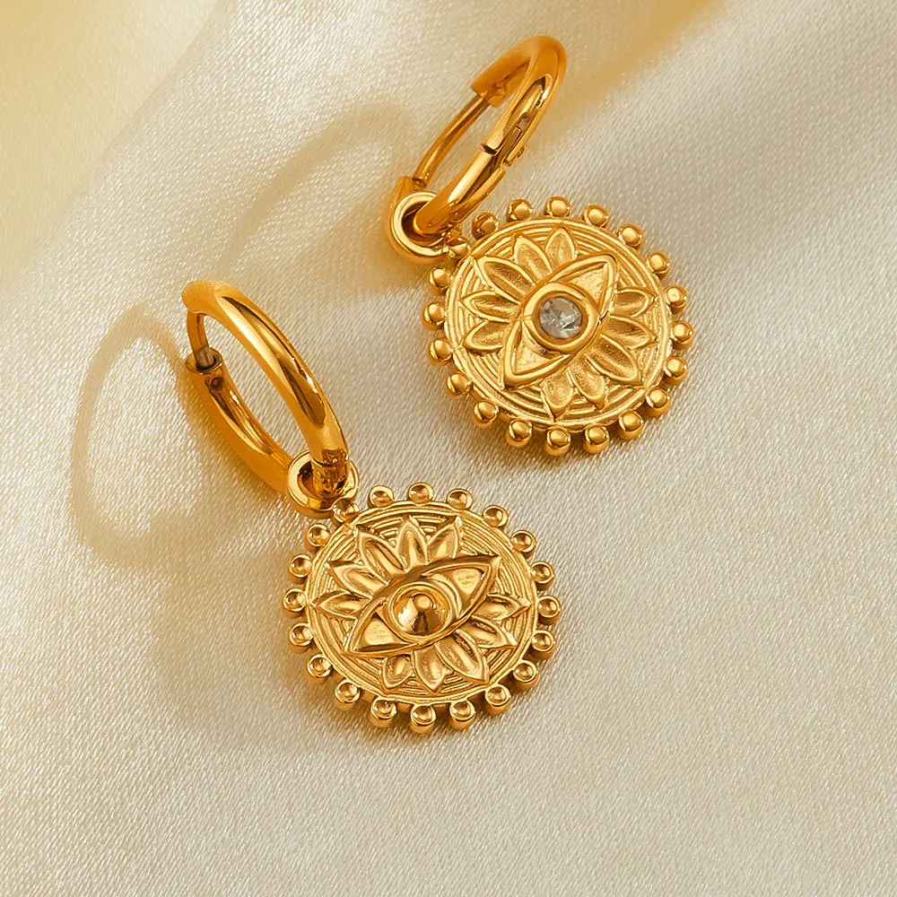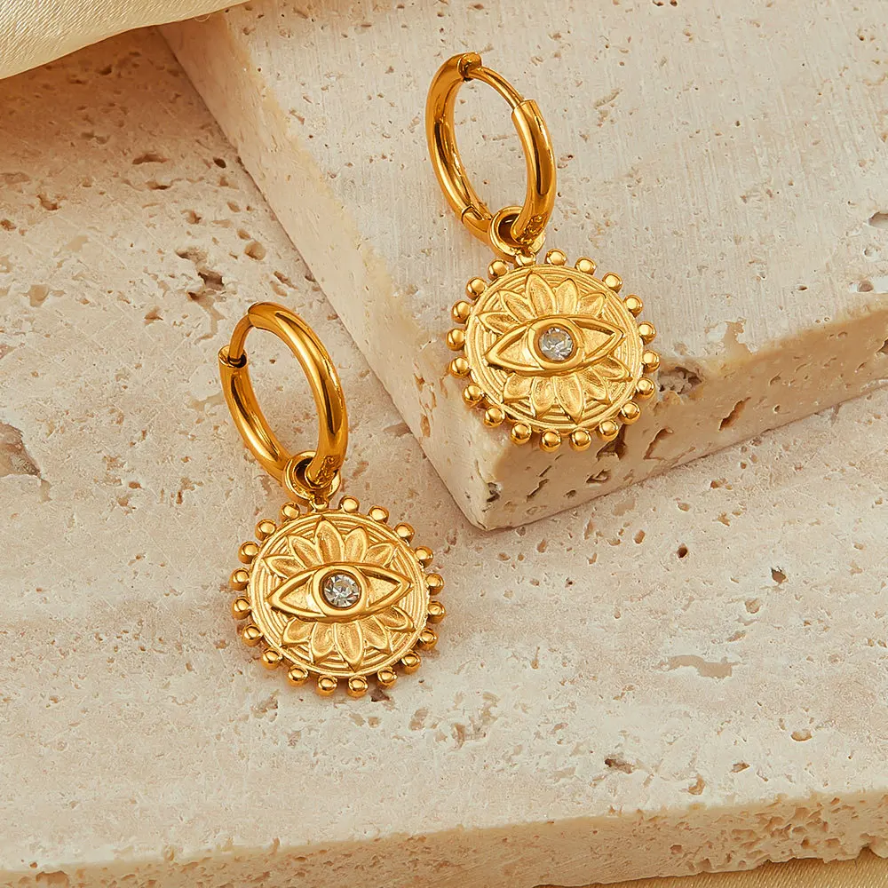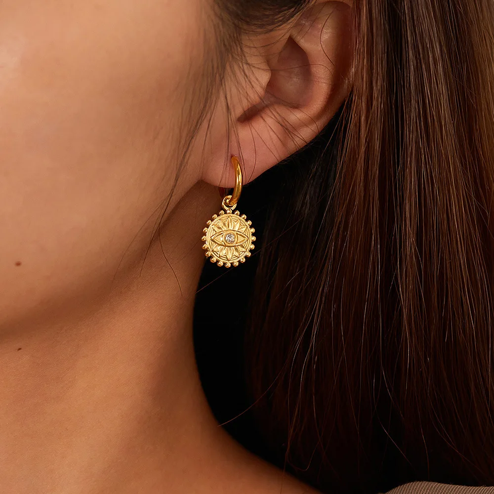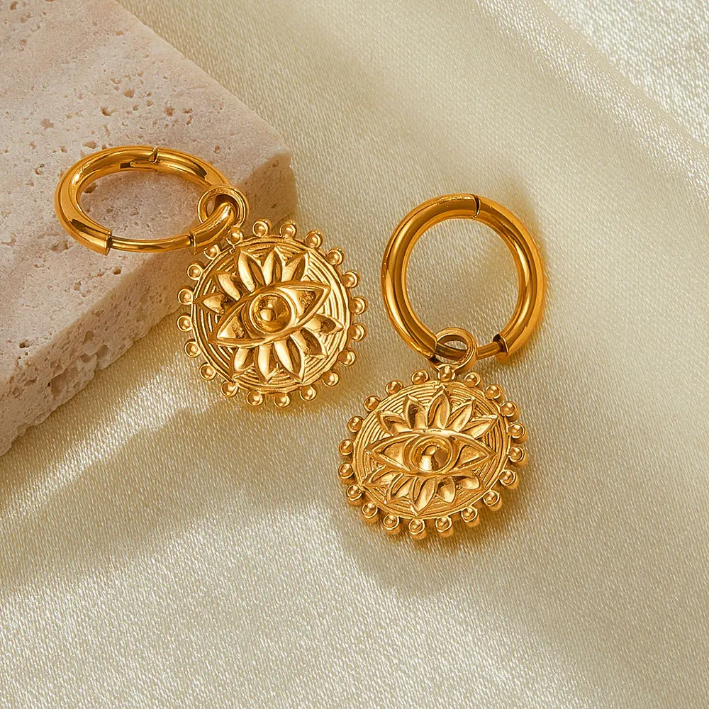 Ouj 2024 Unique Vintage Style Fashion Gold Plated 316L Steel Geometric Round Pendant Turkish Eye Hoop Huggie Earrings for Women