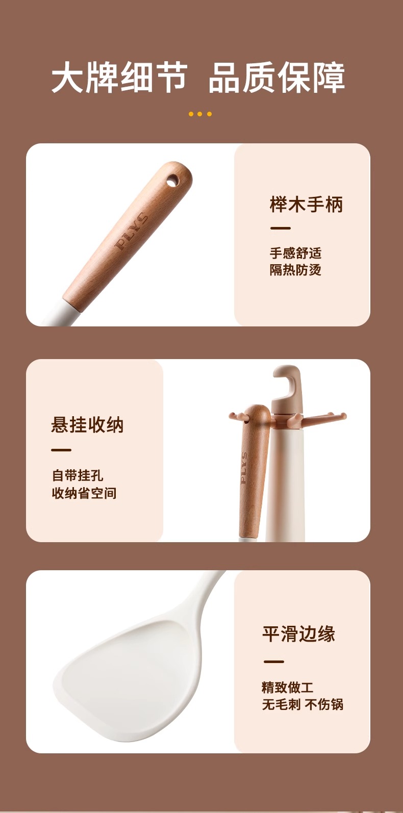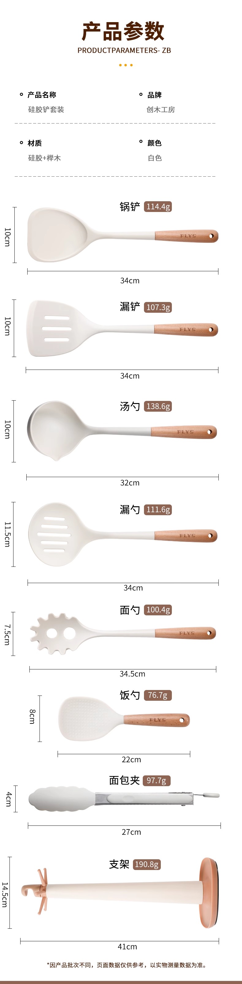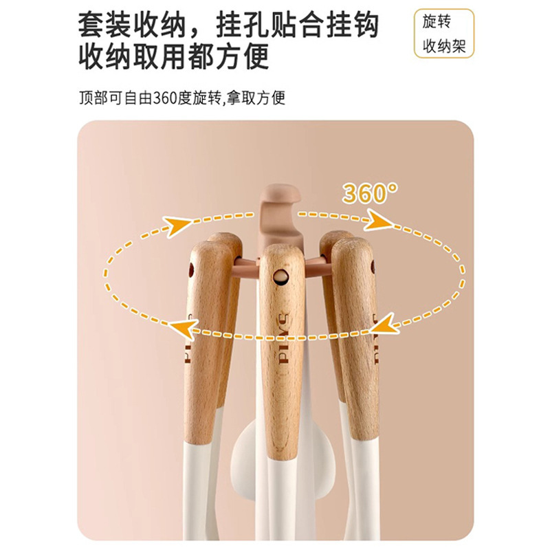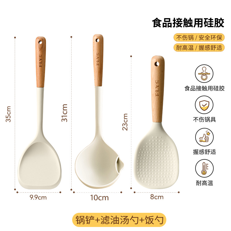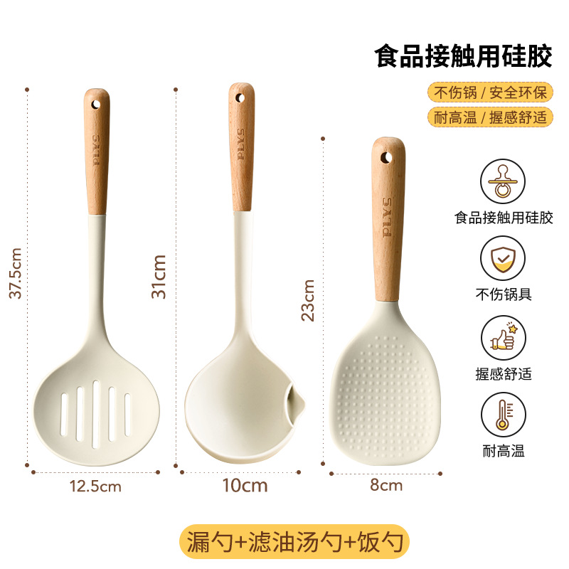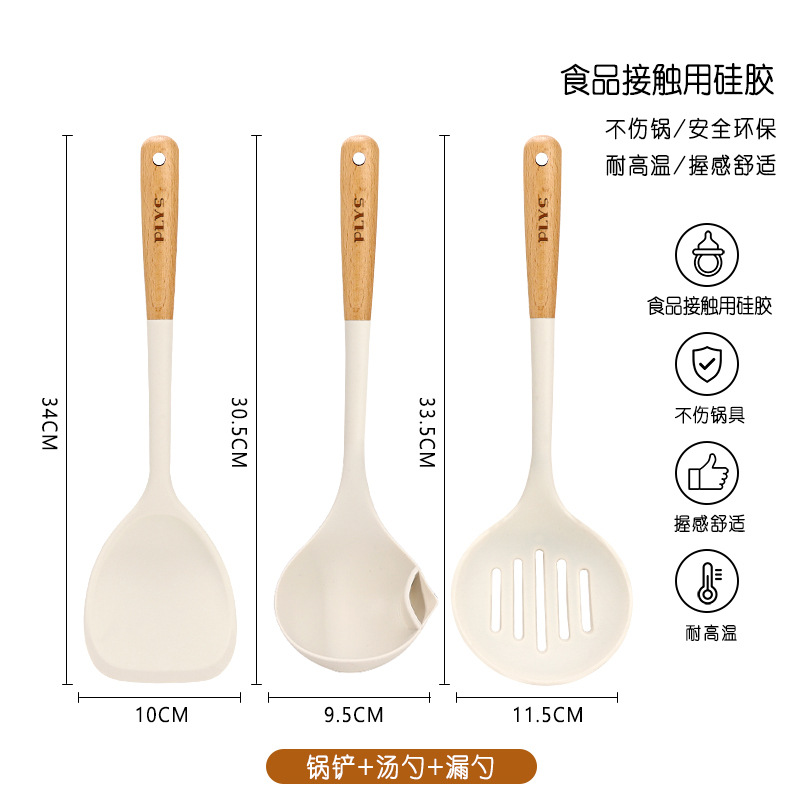 milk white silicone with wooden handle (spatula + soup spoon + colander) + milk white silica gel clip + milk white bracket