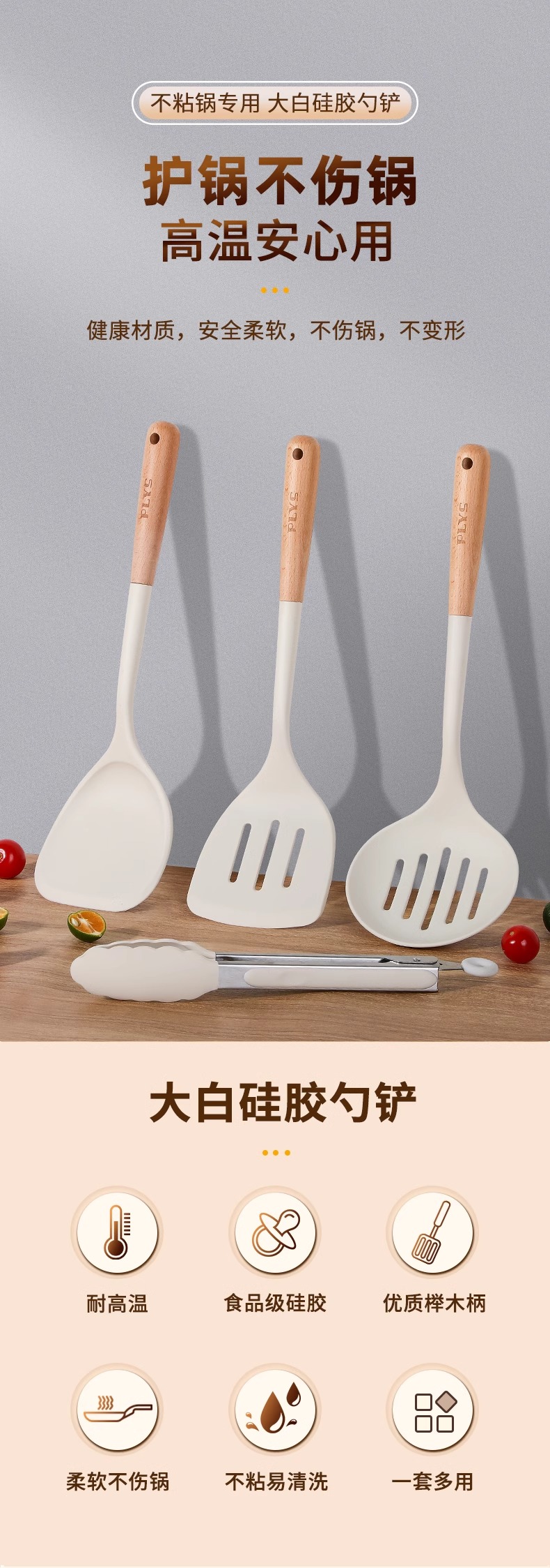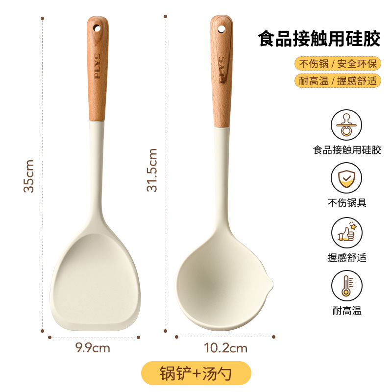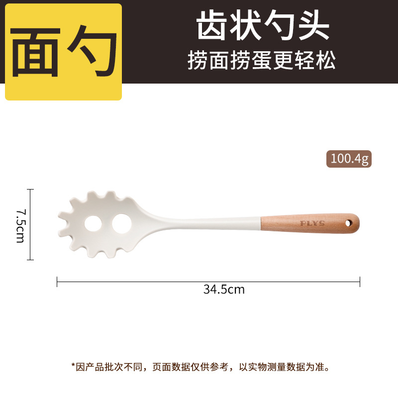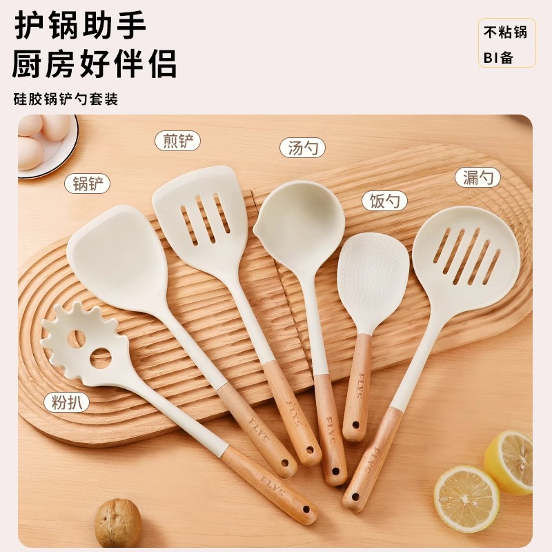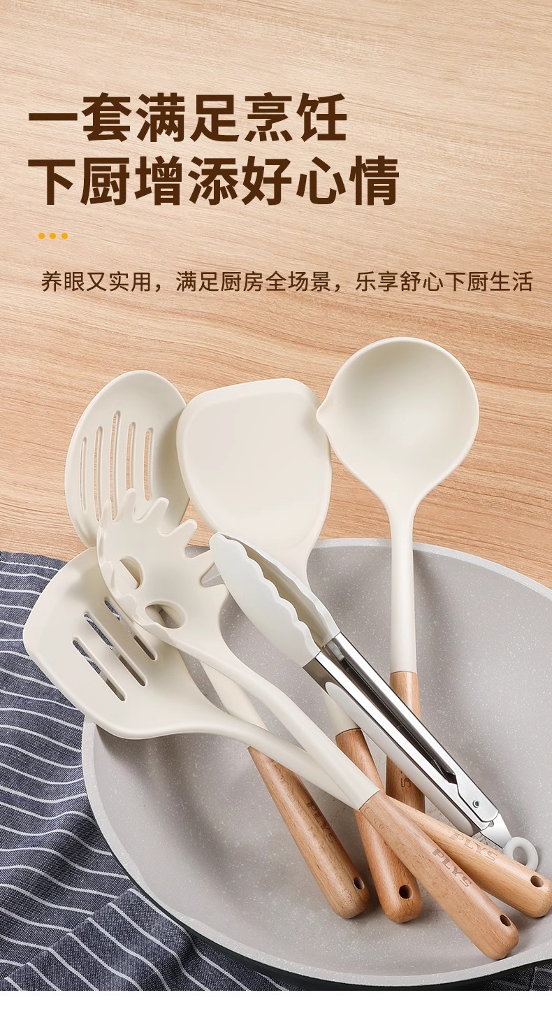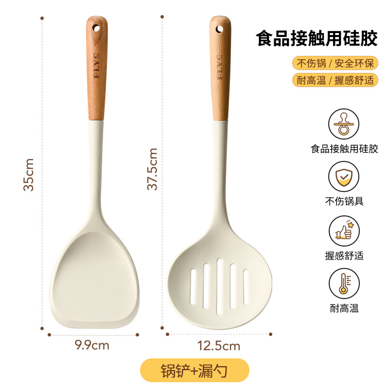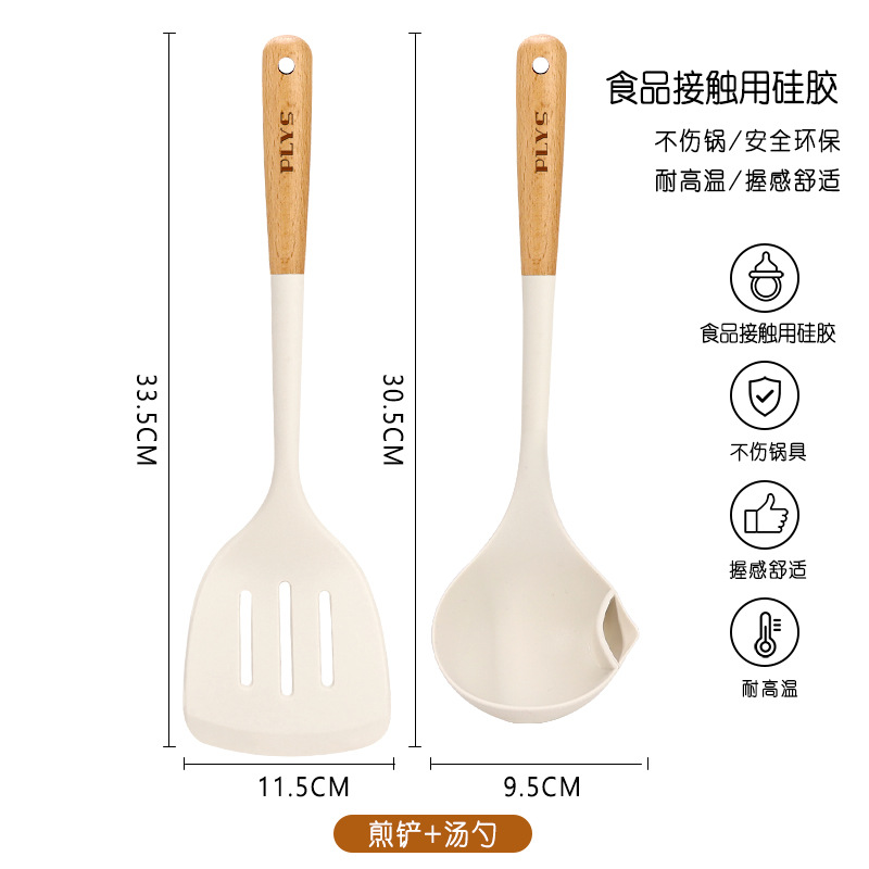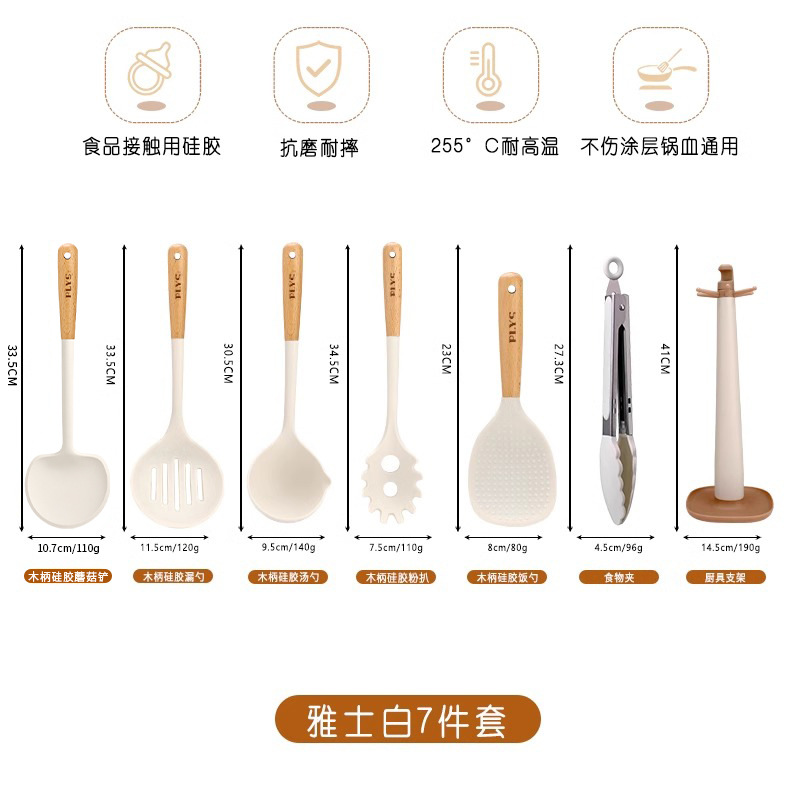 7-piece set-milk white silicone with wooden handle (mushroom shovel + face fishing + meal spoon + soup spoon + colander) + milk white (silica gel clip + bracket)