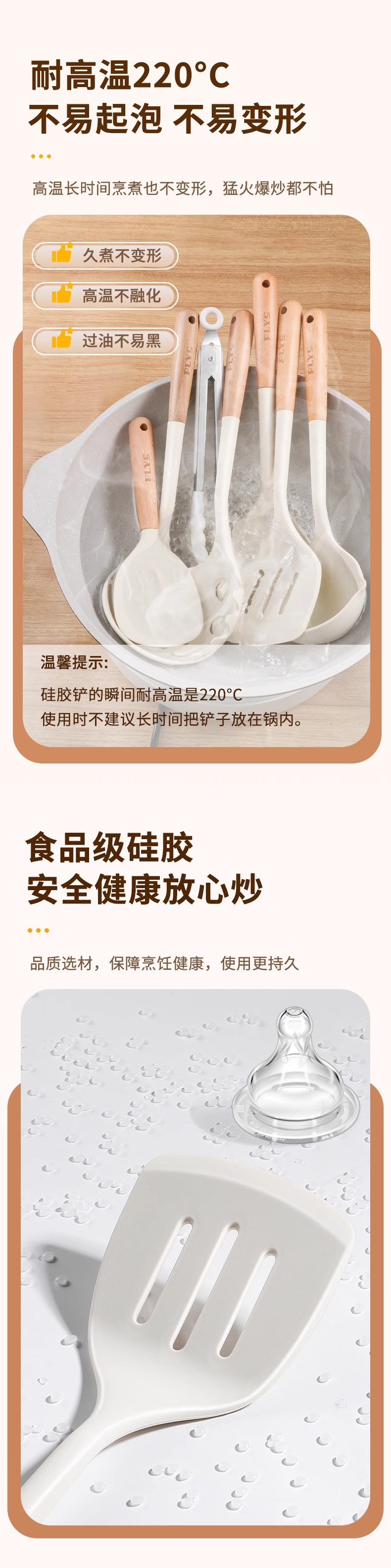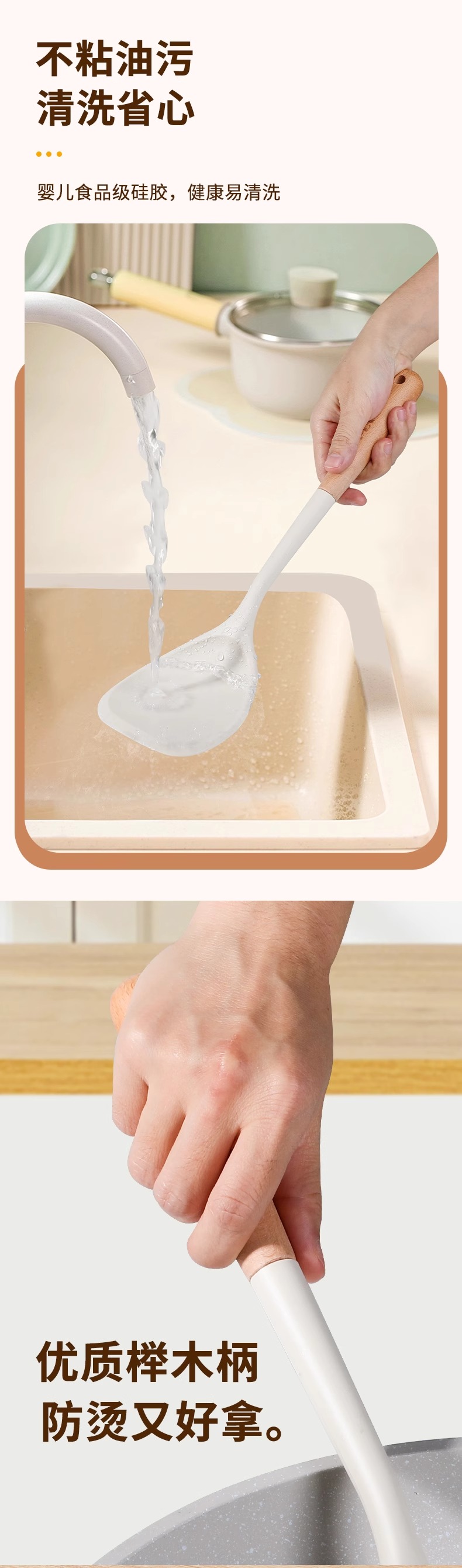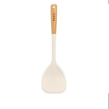 milk white silicone with wooden handle (spatula + meal spoon + oil filter spoon)