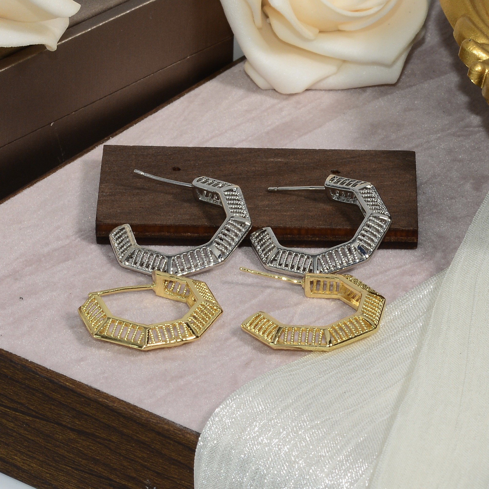 cross-border european and american style fashion hexagonal texture earrings high sense light luxury minority personality metallic ear studs earrings