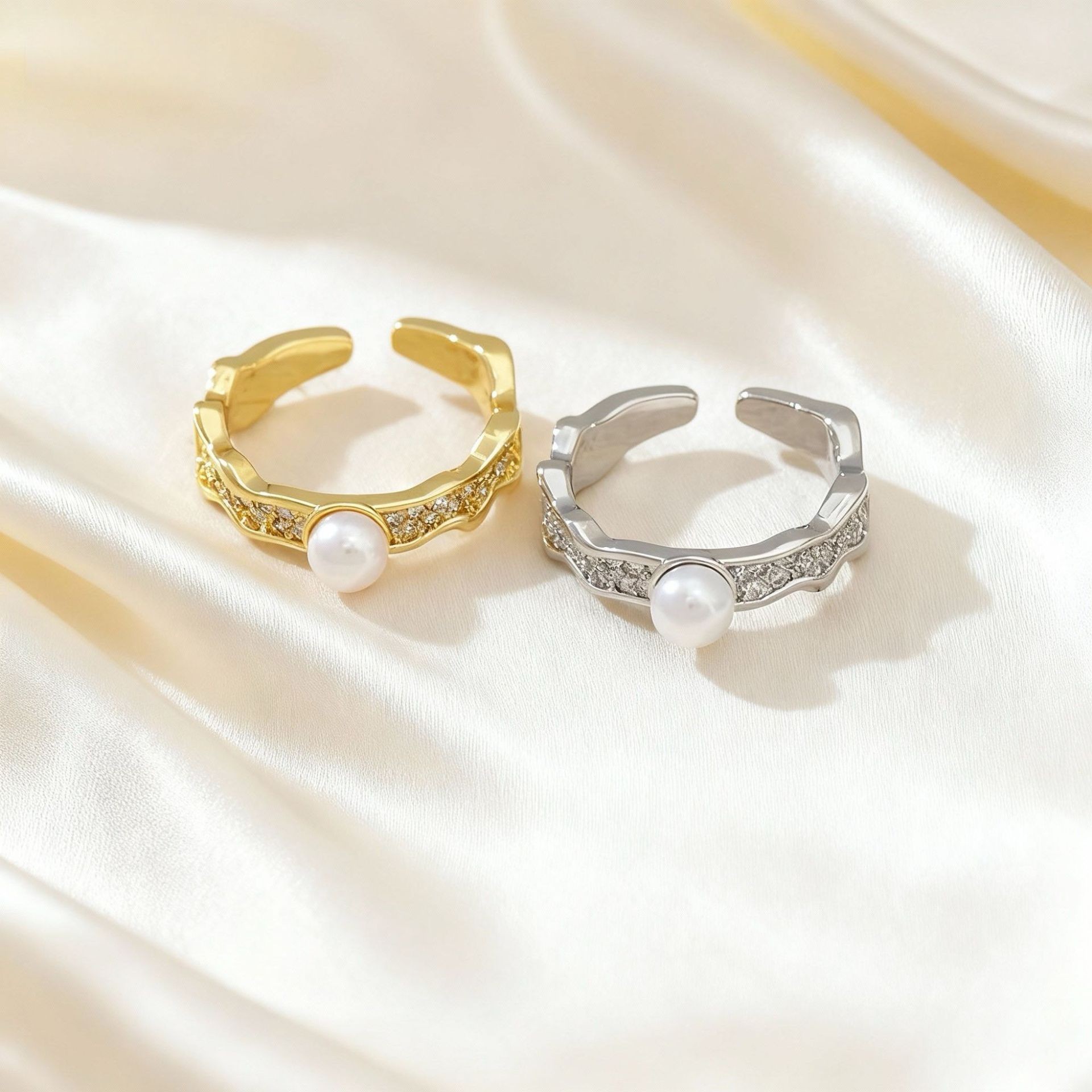 fashion wave-shaped zircon open-end pearl ring light luxury high-end sense daily commuting adjustable index finger ring female