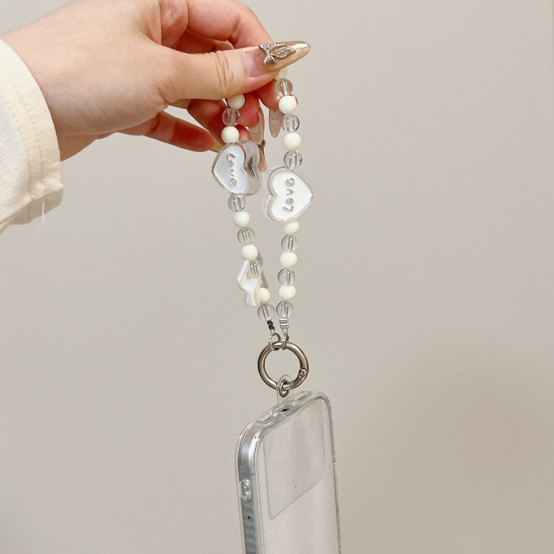 k874 short bracelet transparent white pearl + two love white heart butterfly