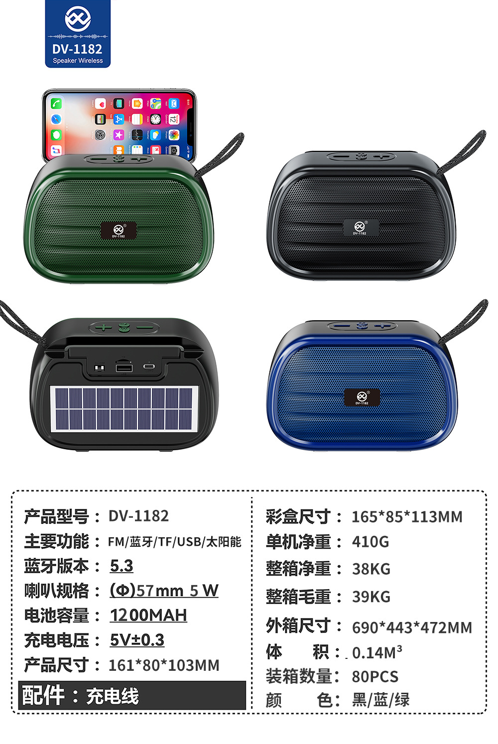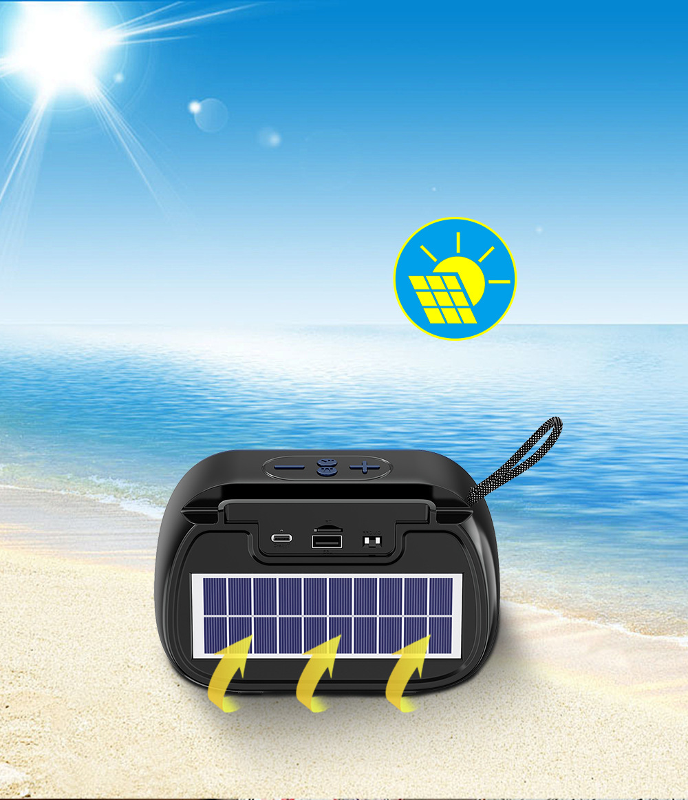 Main functions:5.3 Bluetooth + FM Radio + USB Playback + TF Card Playback + Solar Power