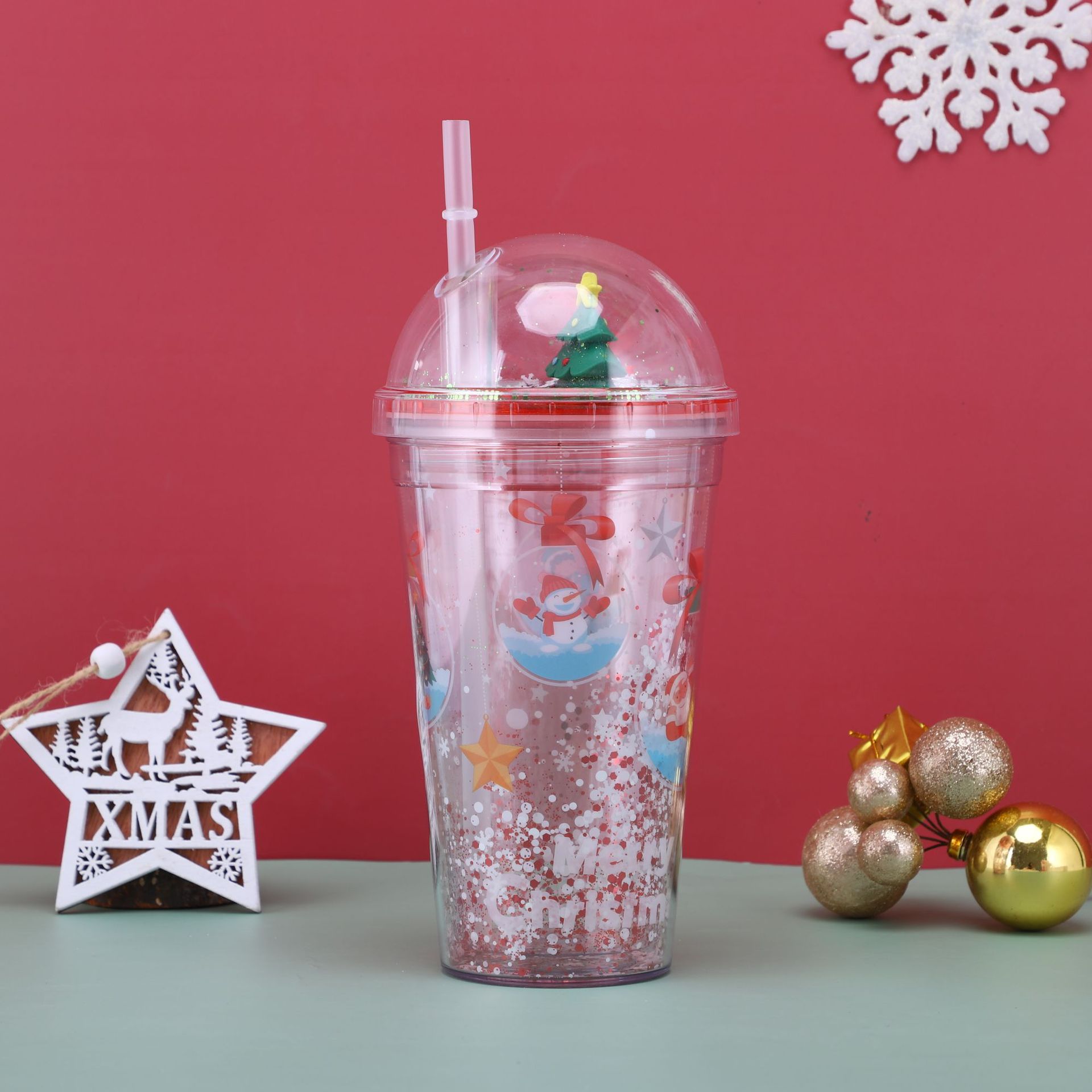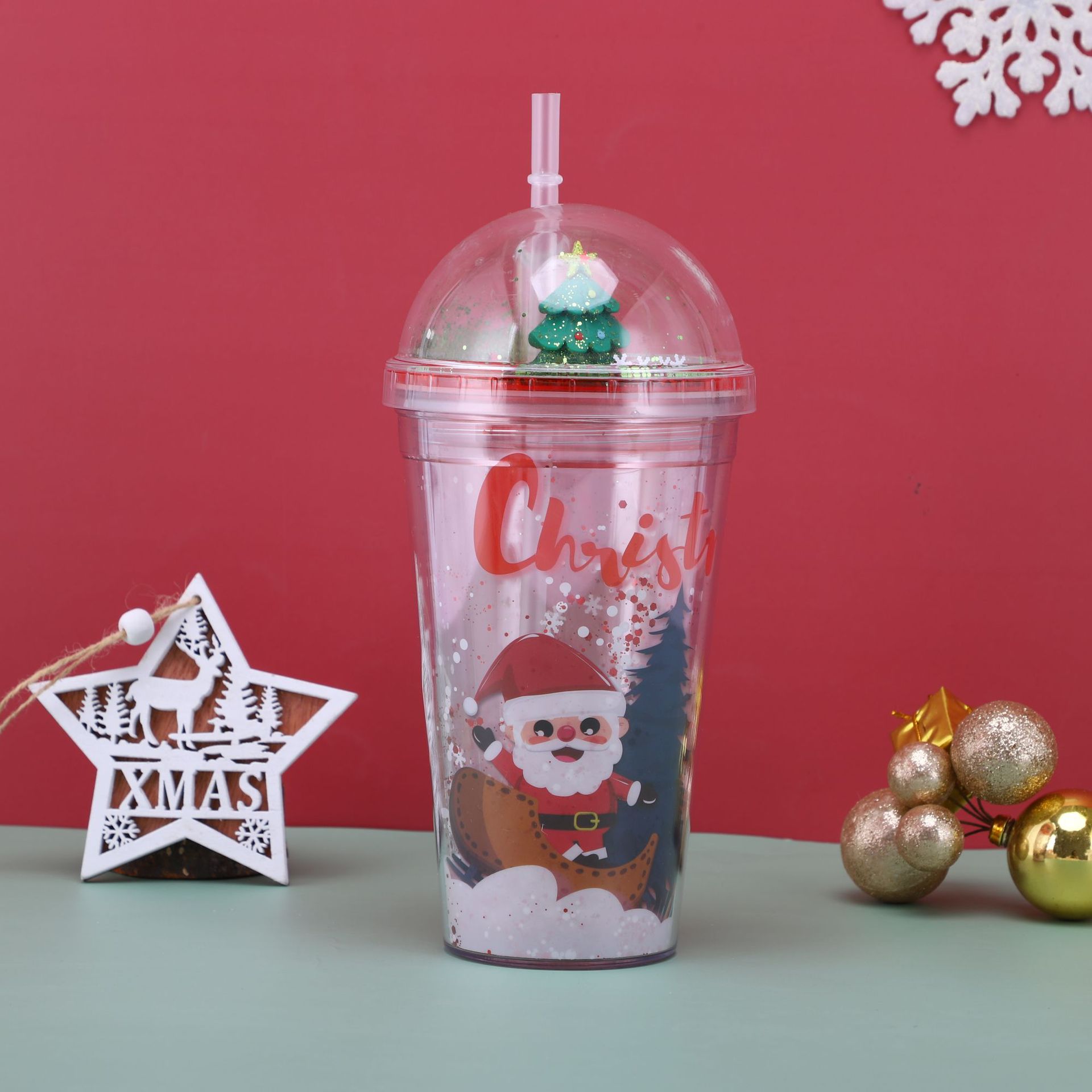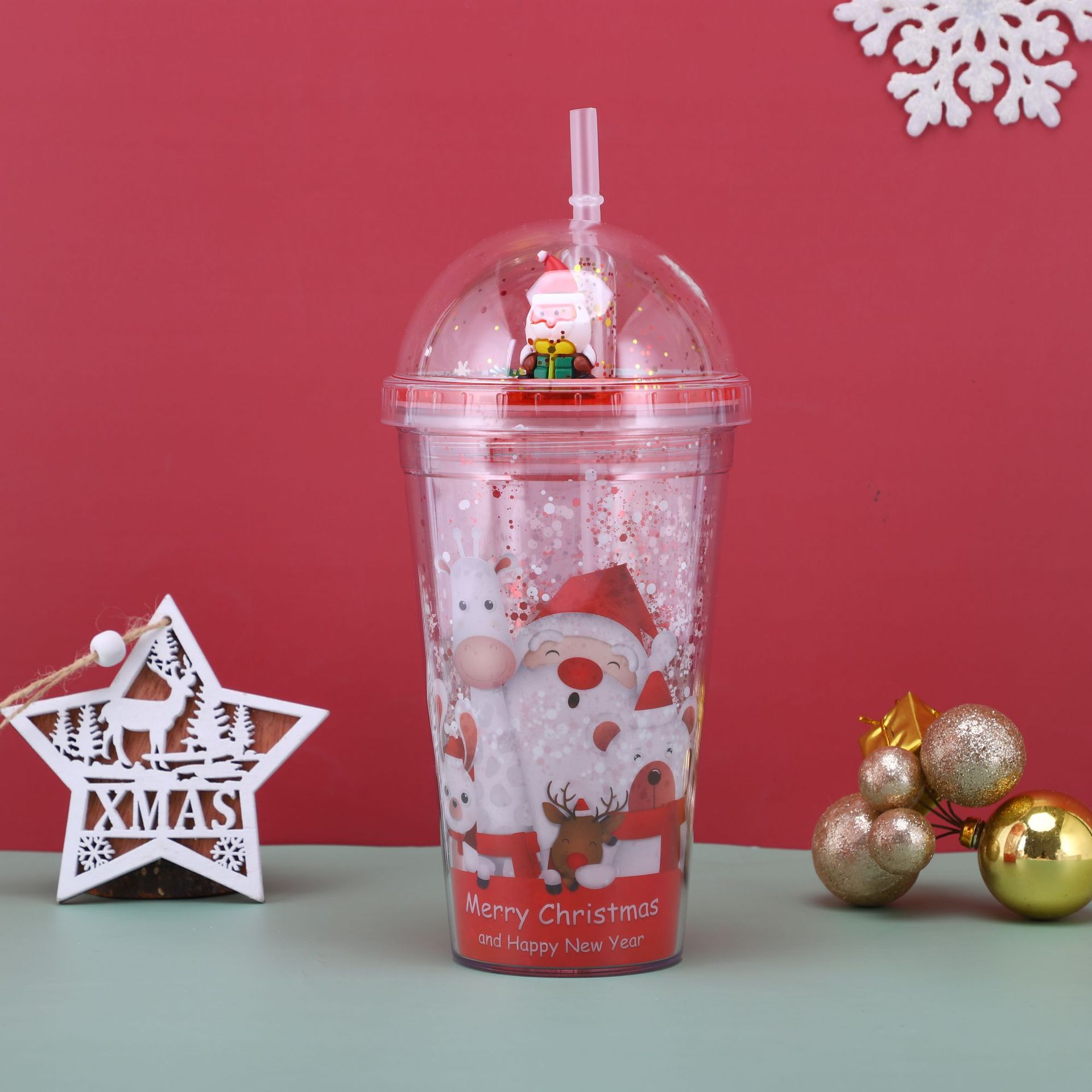 【Product Name】: Christmas Double-Layer Plastic Straw Cup