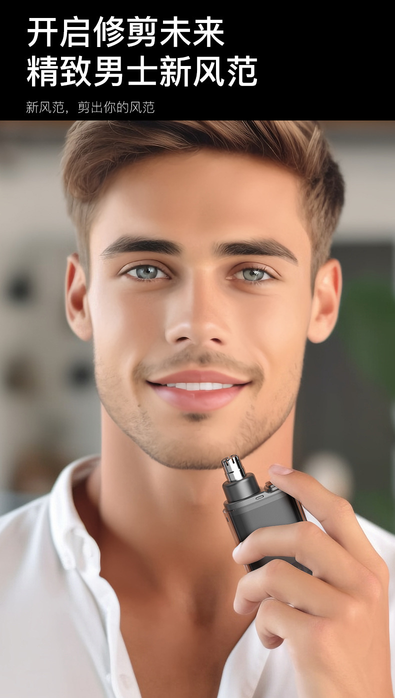 Electric nose hair trimmer, mini fashion design, USB charging convenience, LED LCD display precision. Core selling point: efficient trimming without harming the skin, silent operation.