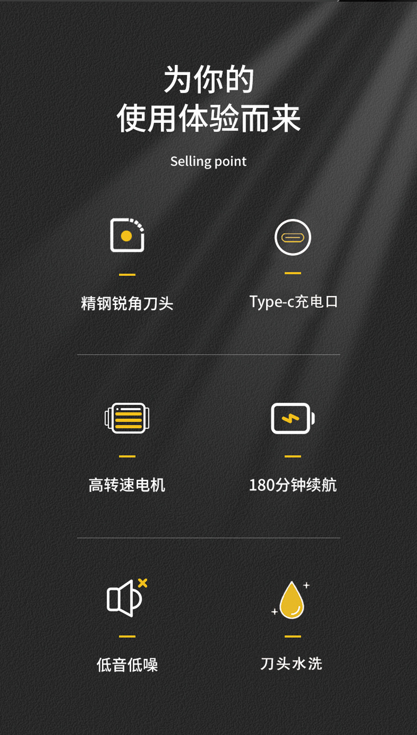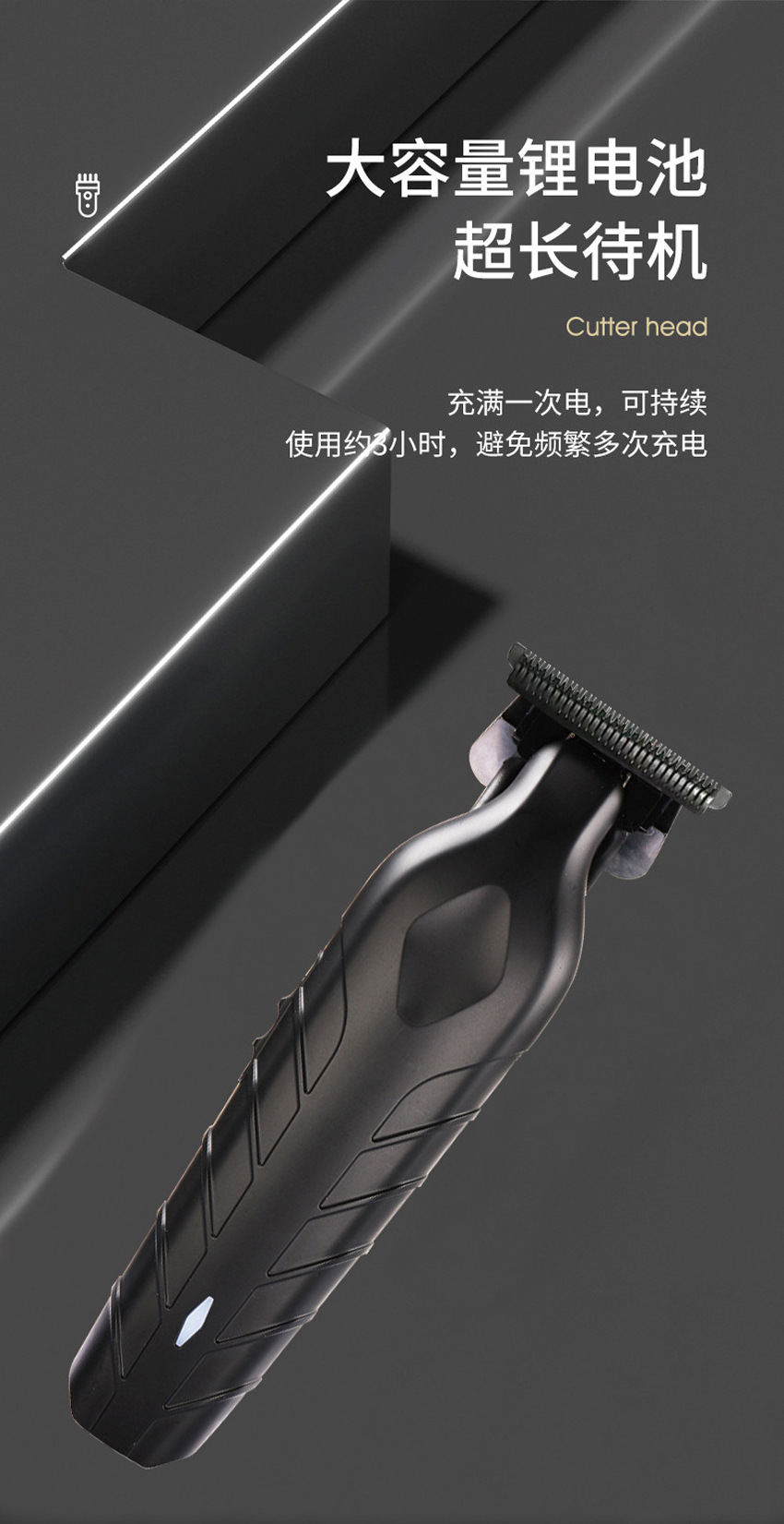 Product advantages: Sharp blade, long-lasting battery life, low noise operation. Solves user pain points: Say goodbye to waiting in line at the barber shop, saving money and time, enjoying a salon-level experience at home.