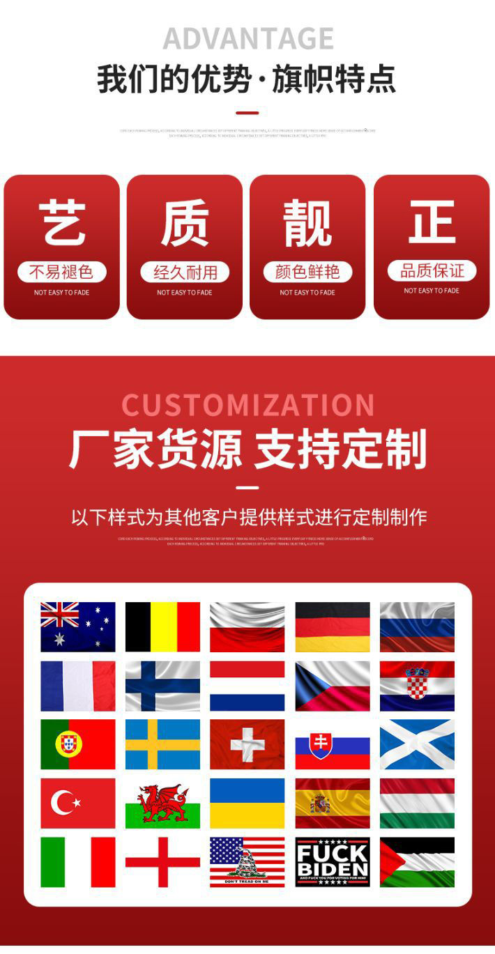 Regarding prices: custom-made flags are determined by the customer's preferences for the flag's material, printing, production, specifications, and quantity. The prices listed in the shop are for reference only, and the details on the product page are for display purposes only. Product details will continue to be updated and optimized, resulting in slight differences. The final product is the authoritative standard. If you need to order, please contact customer service.