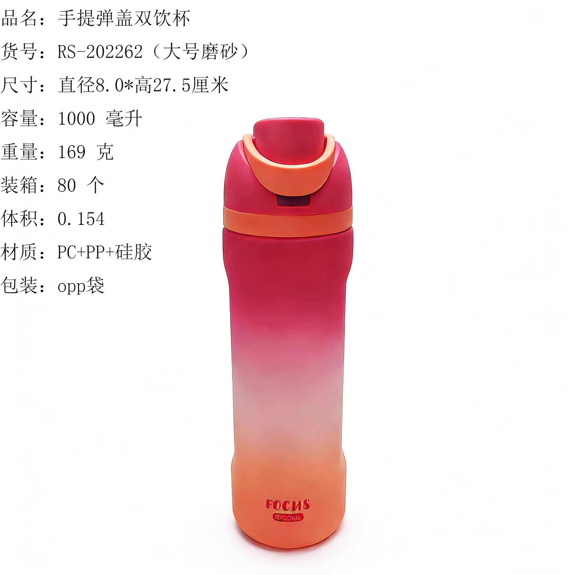 ITEM NO.【Product Model Number】: RS-202261 NAME【Product Name】: New Transparent Elastic Lid Dual-Drink Cup QTY【Quantity】: 80 pieces "CBM【纸箱体积】:0.154 Material【Product Material】: PC+PP+Silicone Color【Product Color】: mixed loading Weight: 169 grams Volume【Product Capacity】: 1000 ml Packaging【包装方式】:OPP袋 W.G【整箱毛重】:14.5kilogram N.G【Gross Weight of the Full Container】: 13.5 kg"斤"在中文中通常指的是重量单位,1斤等于500克。如果您需要翻译其他与"斤"相关的文本,请提供具体内容。 SIZE【Product Size】: Maximum Diameter 8.0* Height: 27.5 inchescentimeter