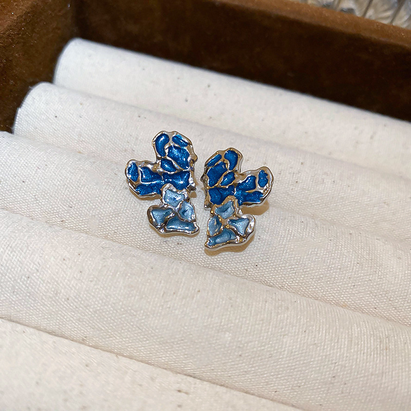 40# silver needle flower stud earrings-blue