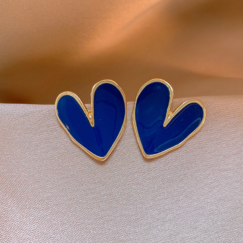 19# silver needle love heart stud earrings-blue