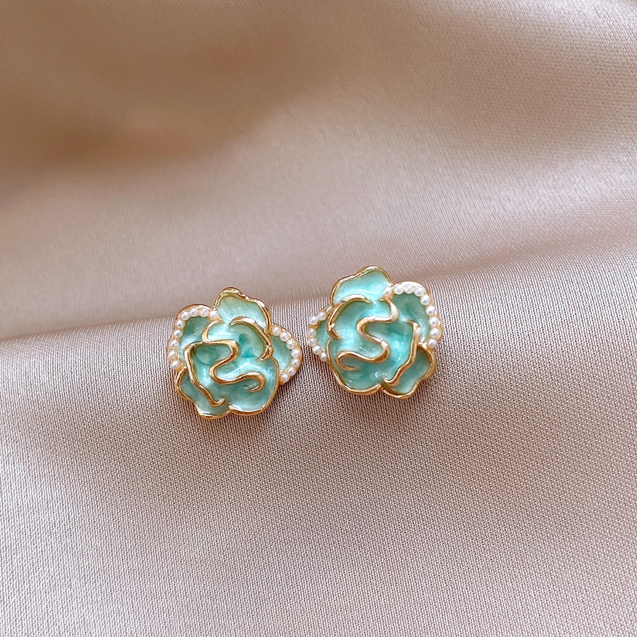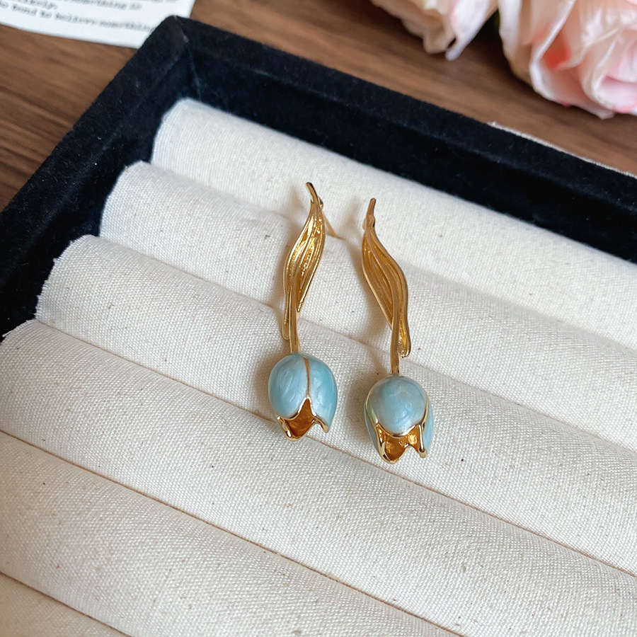 51# silver needle flower stud earrings-golden-blue
