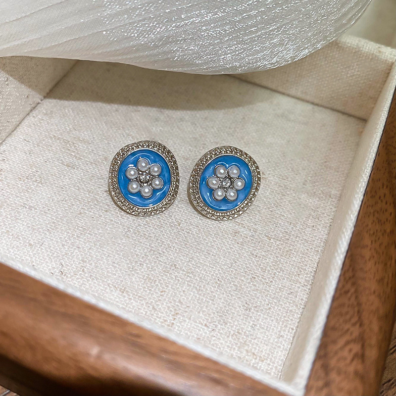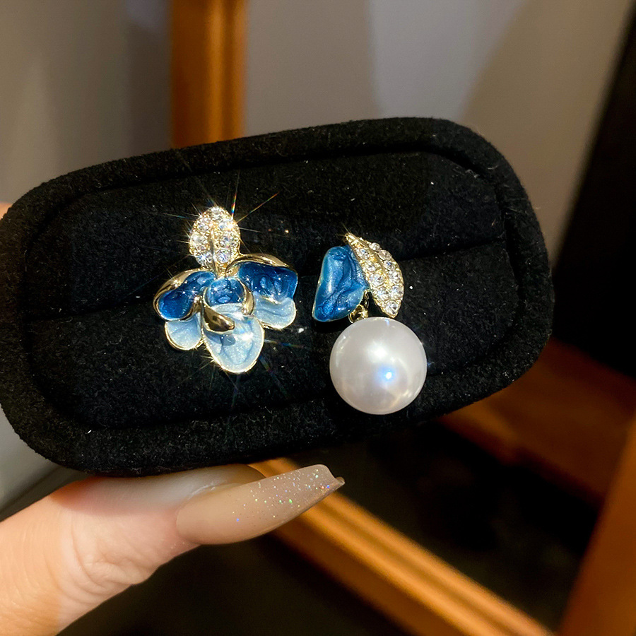 23# silver needle pearl flower earrings-blue