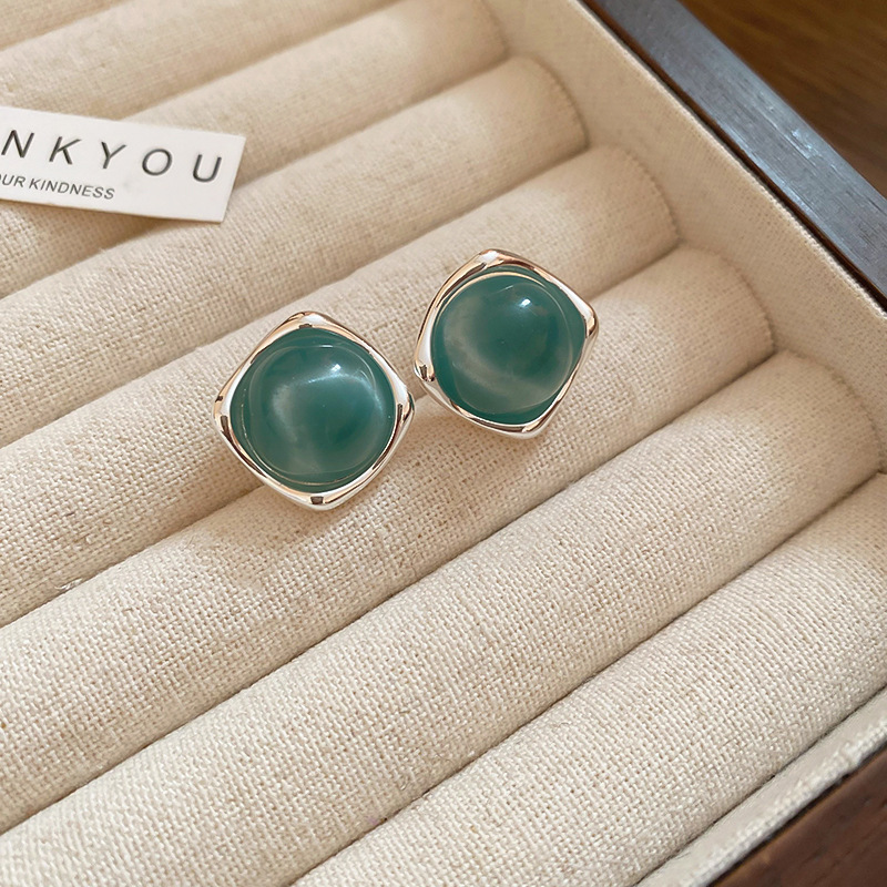 37# green stone stud earrings (real gold plating)-golden-blue.
