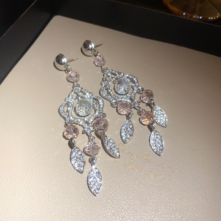 17# silver stud rhinestone-encrusted leaf tassel ear studs