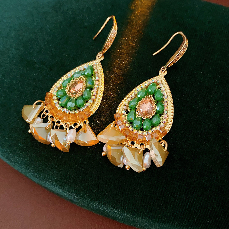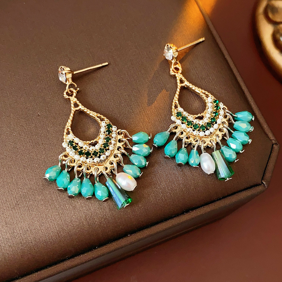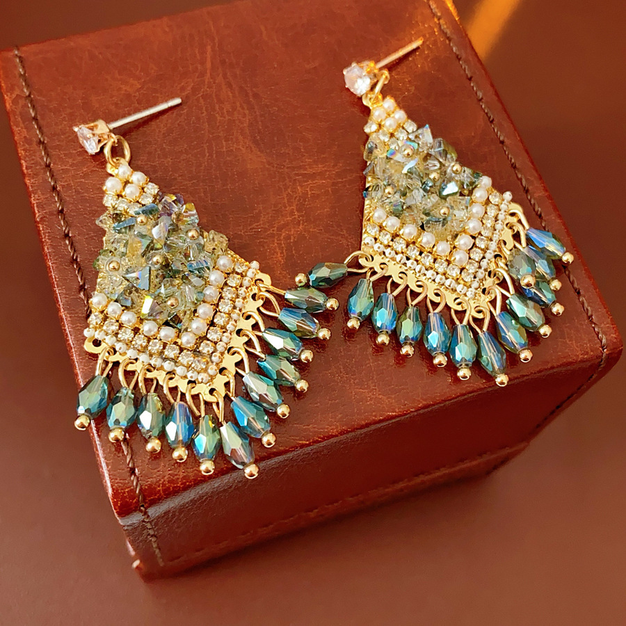 36# green silver stud rhinestone-encrusted water drop tassel stud earrings