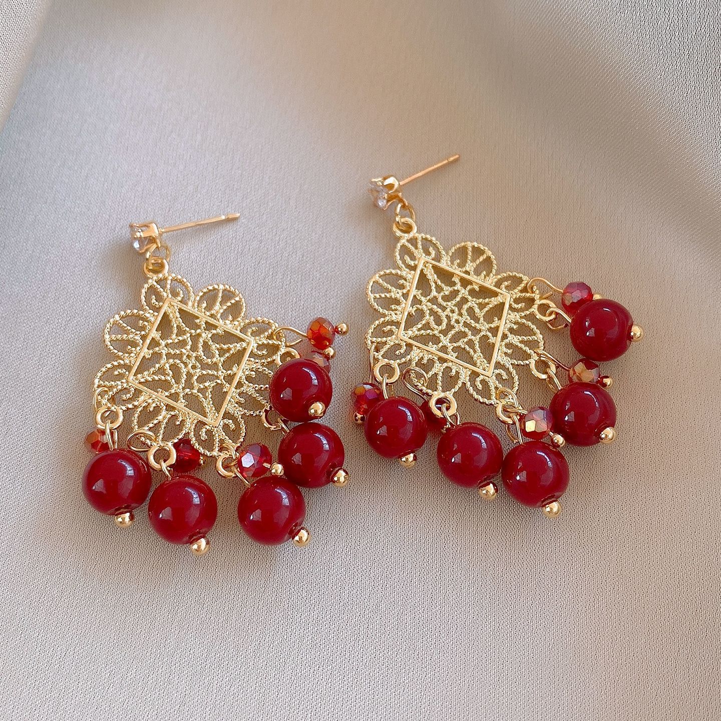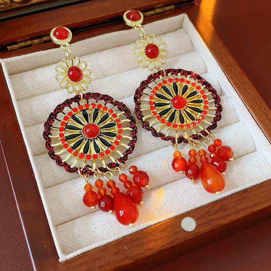 41# red and blue diamond round pearl tassel ear hook