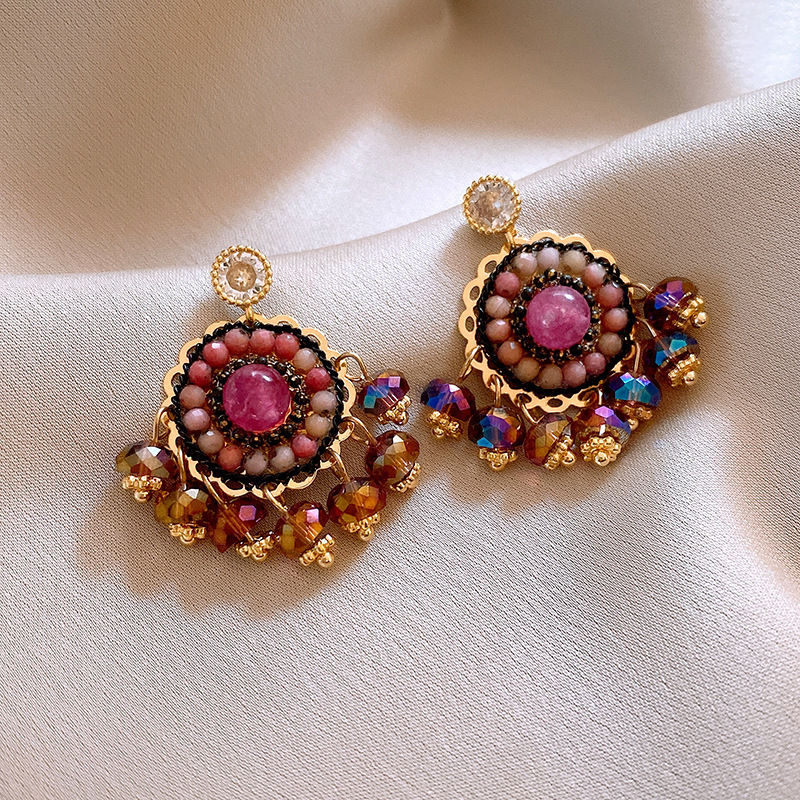 45# silver needle glass round tassel ear studs