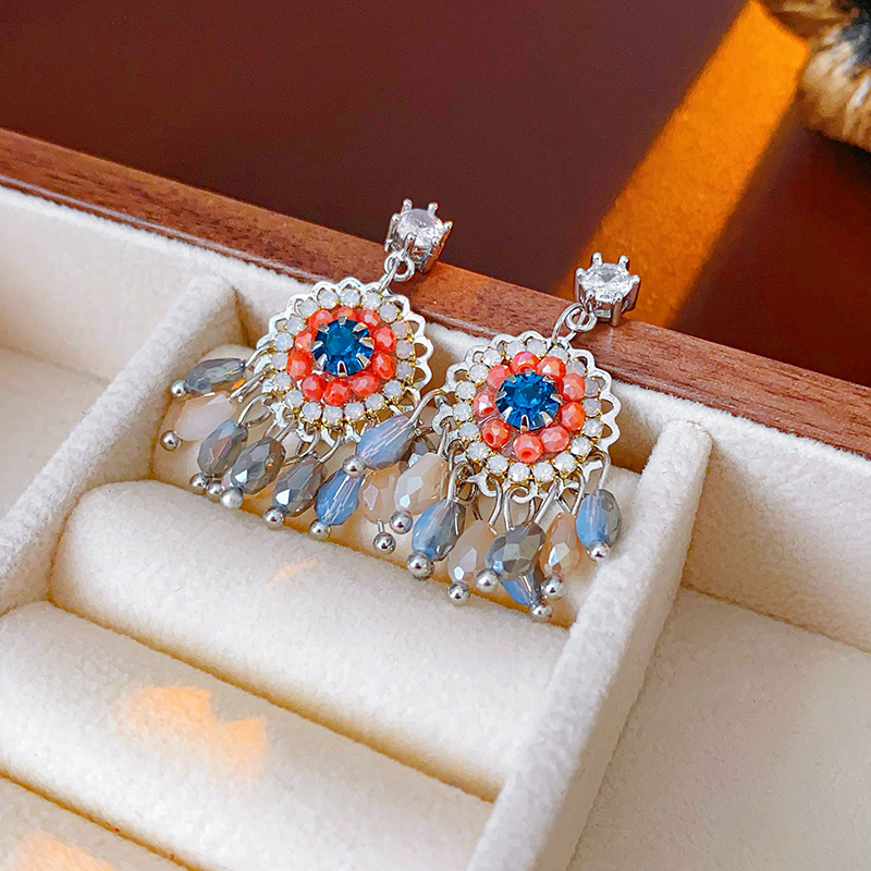 9# silver needle flower rhinestone-embedded crystal tassel stud earrings
