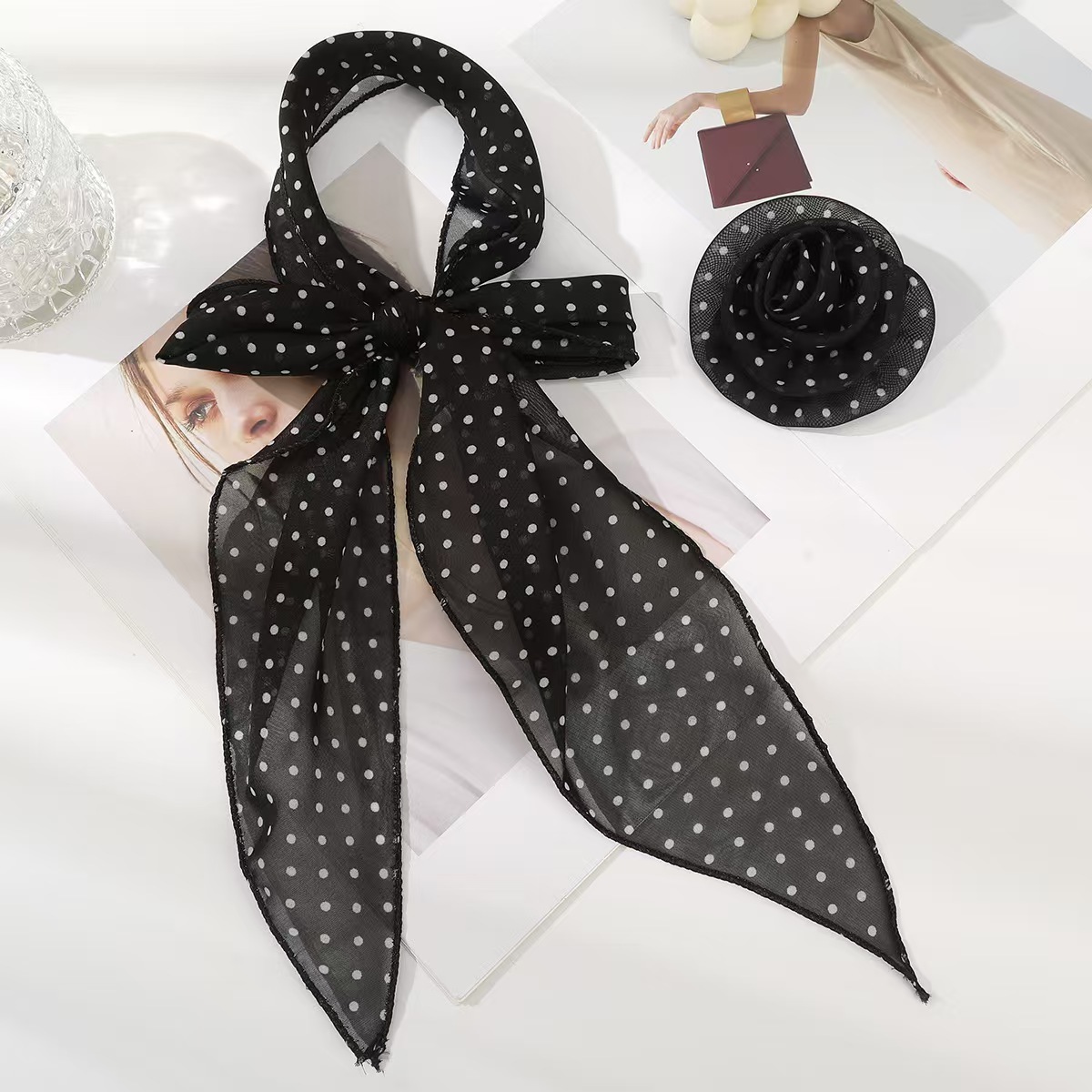 black background big white polka dot-silk scarf + rose