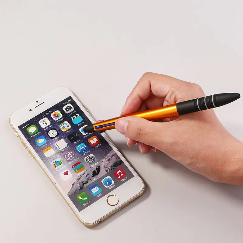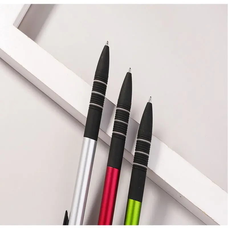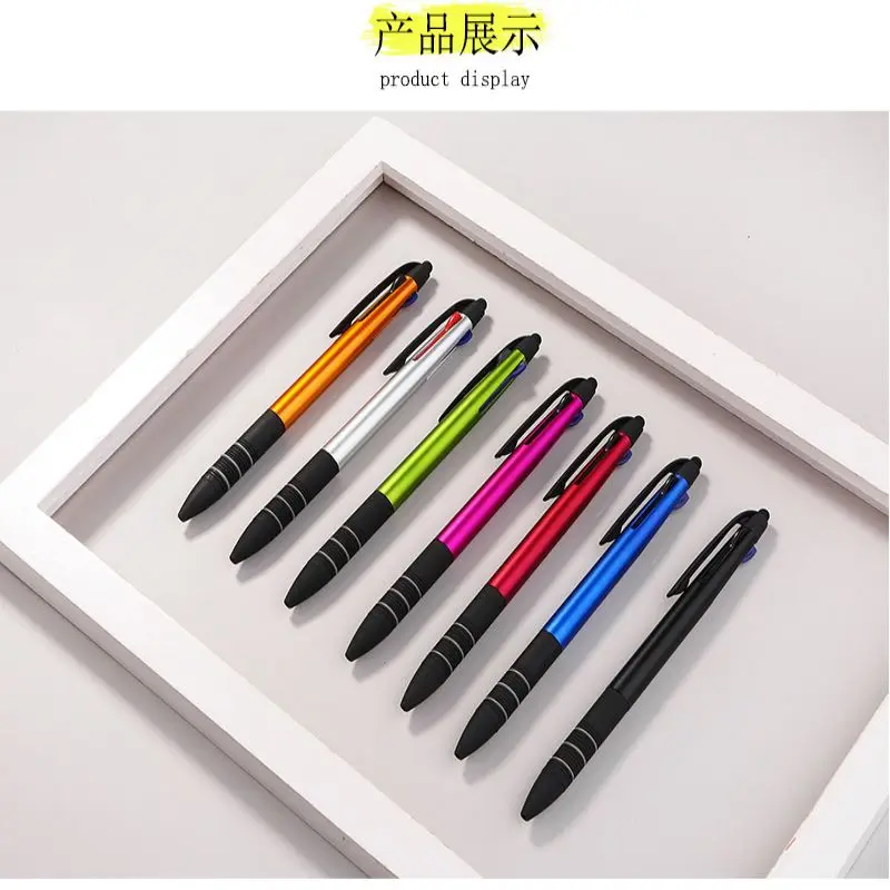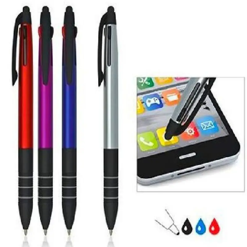 Plastic click action, 3 color (red, blue, black) ballpoint pen with rubber grip and stylus.