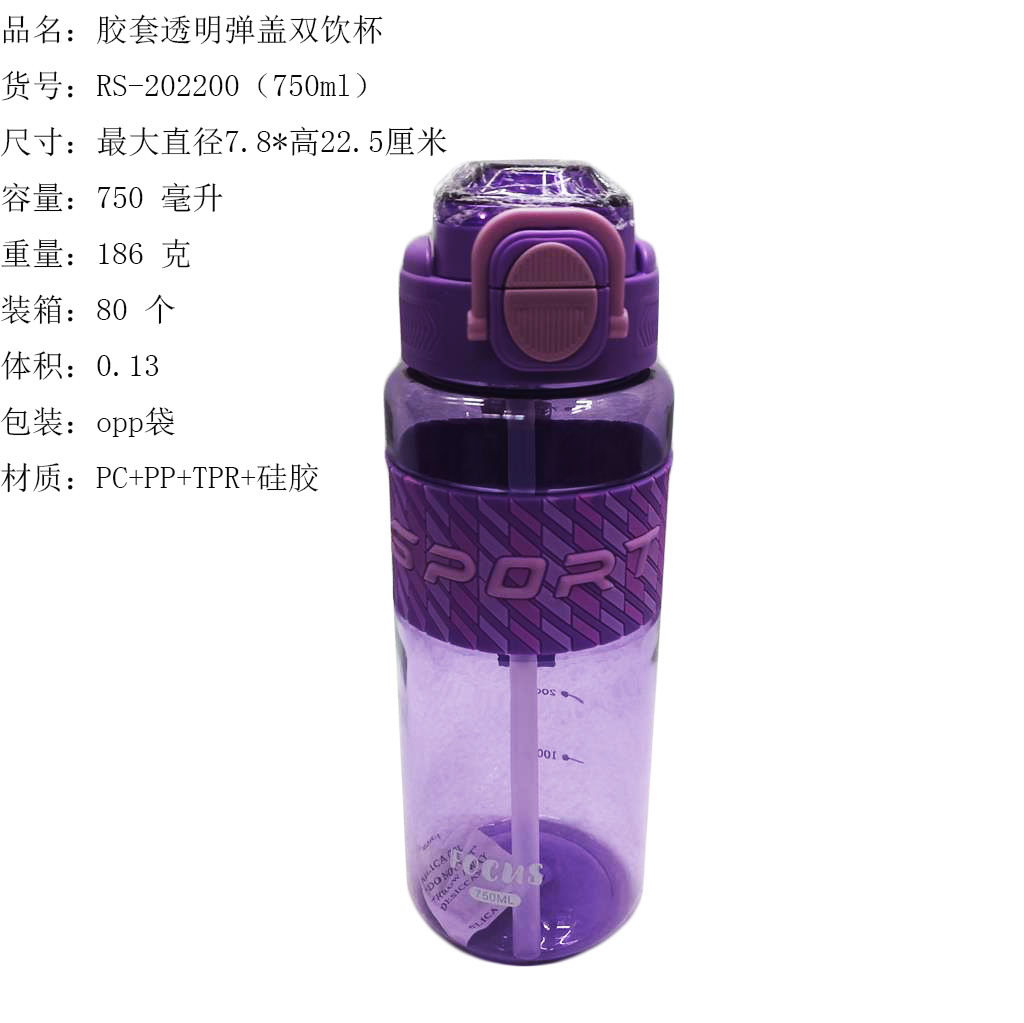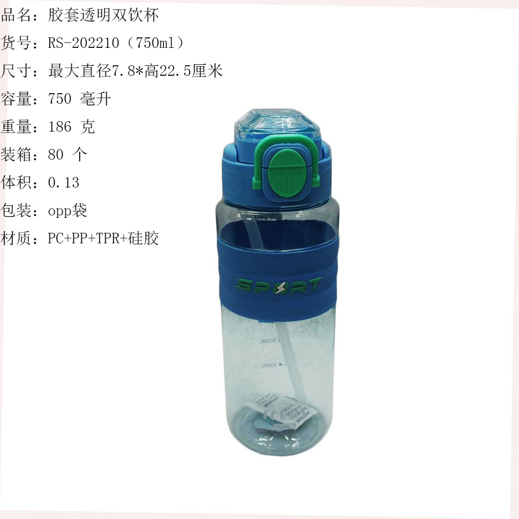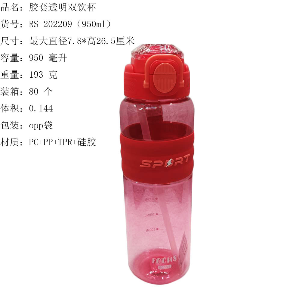 ITEM NO.【Product Model Number】: RS-202195 NAME【Product Name】: Transparent Elastic Lid Double-Dose Cup QTY【Quantity】: 80 pieces "CBM【纸箱体积】:0.144 Material【Product Material】: PC+PP+TPR+Silicone Color【Product Color】: mixed loading Weight: 214 grams Volume【Product Capacity】: 950 ml Packaging【包装方式】:OPP袋 W.G【整箱毛重】:18kilogram N.G【Gross Weight of the Full Container】: 17 KG"斤"在中文中通常指的是重量单位,1斤等于500克。如果您需要翻译其他与"斤"相关的文本,请提供具体内容。 SIZE【Product Size】: Diameter 7.8* Height: 26.5 inchescentimeter