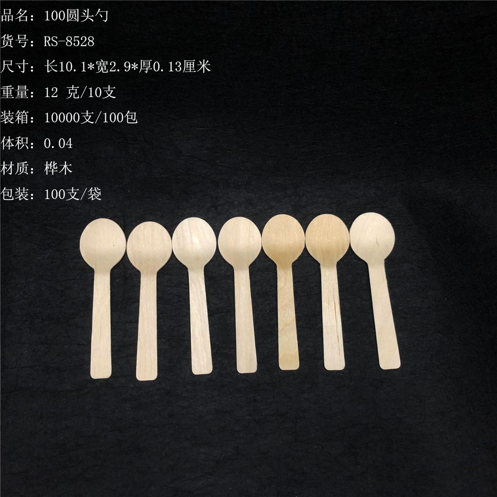 ITEM NO.【Product Model Number】: RS-8526 NAME【Product Name】: Disposable Wooden Pointed Spoon QTY【Quantity】: 10000 pieces/100 packages "CBM【纸箱体积】:0.03 Material【Product Material】: Birch Wood Color【Product Color】: Original color and clean appearance Weight【Product Weight】:13 grams/10 pieces Packaging【包装方式】:100支一OPP袋" "Packaging【包装方式】:100支一OPP袋 "W.G【Gross Weight of a Full Container】:14kilogram N.G【Gross Weight of the Full Container】: 13 KG"斤"在中文中通常指的是重量单位,1斤等于500克。如果您需要翻译其他与"斤"相关的文本,请提供具体内容。 SIZE【Product Size】: Length 11*Width 2.35* Thickness 0.13centimeter