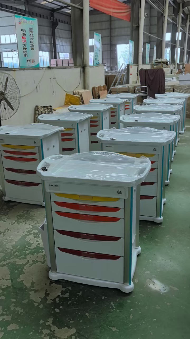 The top is equipped with a blue storage platform, and the center has a IV rack hook, which can hang IV bags/bottles.The left side extends with a foldable small table, which is convenient for medical staff to place items or record during resuscitation.The unit is equipped with silent swivel wheels, which makes it convenient for quick movement within the ward.The right side is equipped with a sharp container storage area (yellow and red color scheme) and additional storage compartments, designed for the storage of medical waste and other supplies.