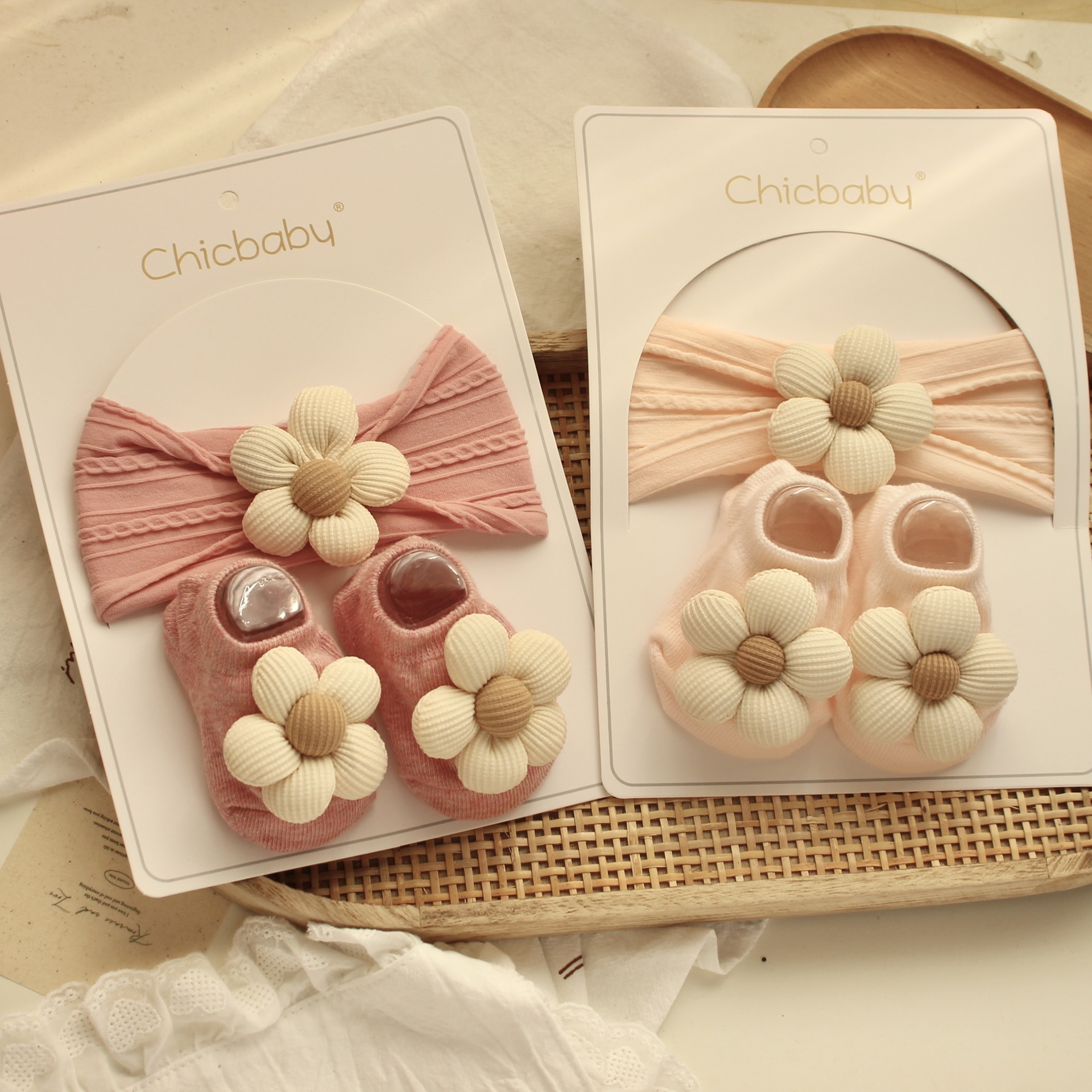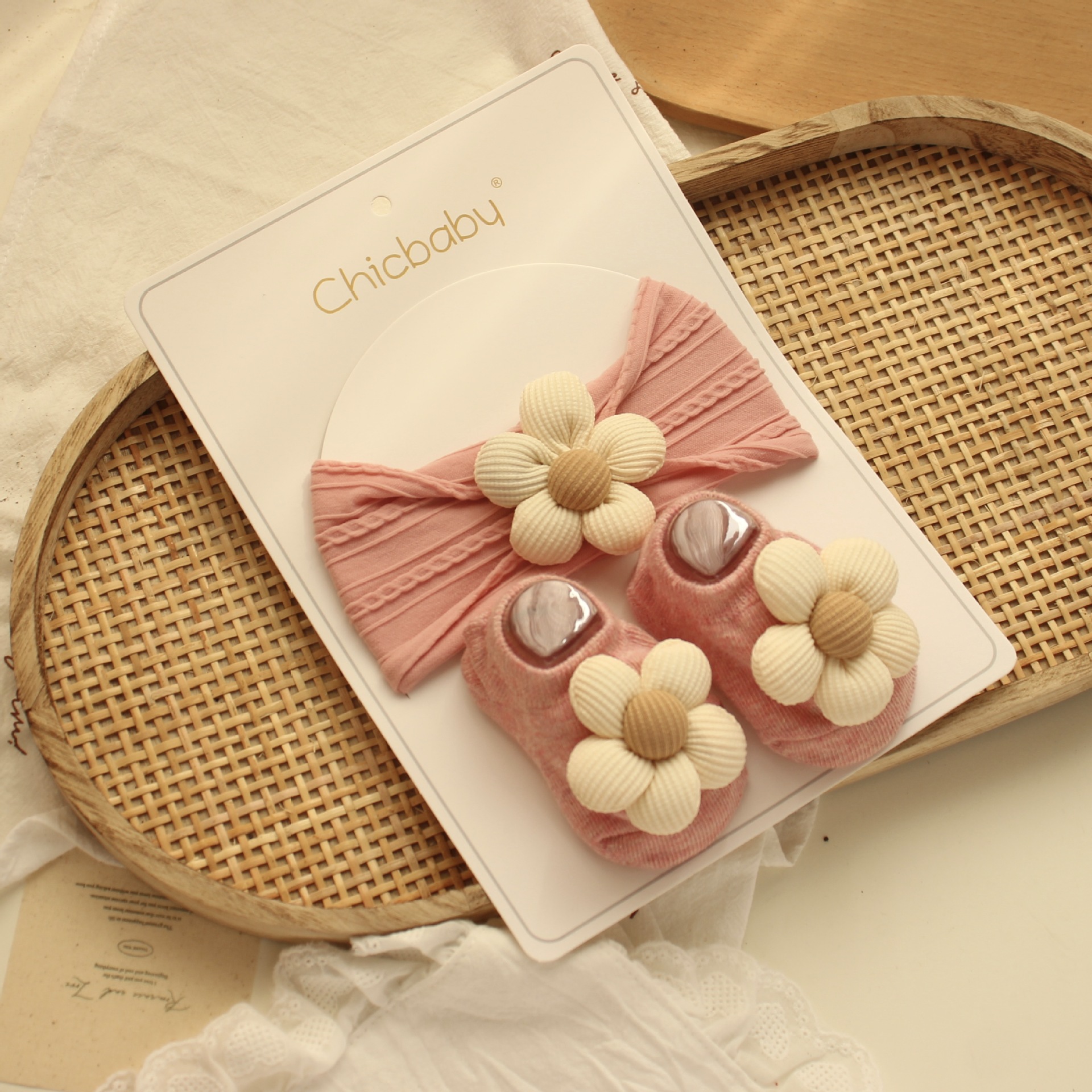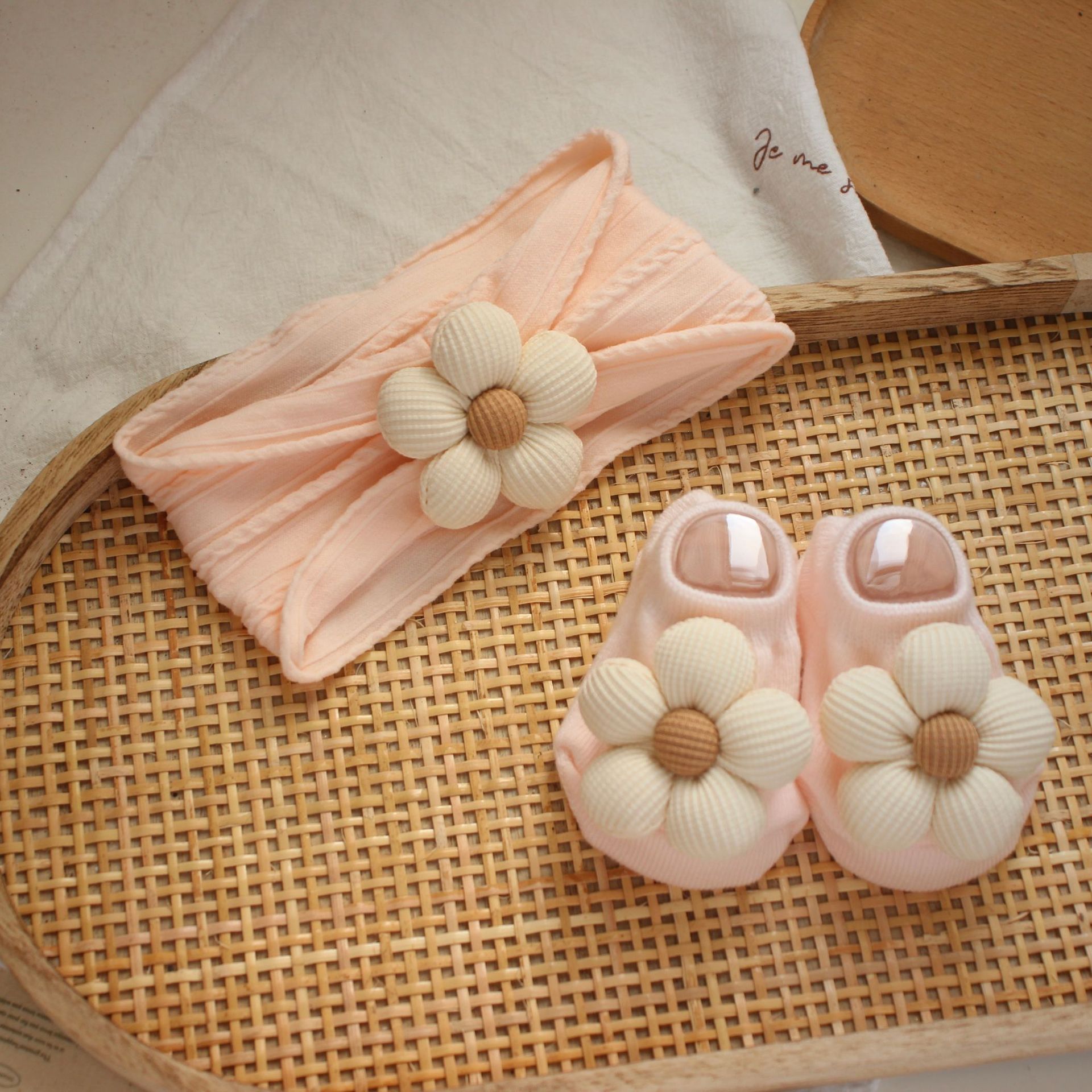 light pink jacquard hair band + beige flowers + light pink boat socks