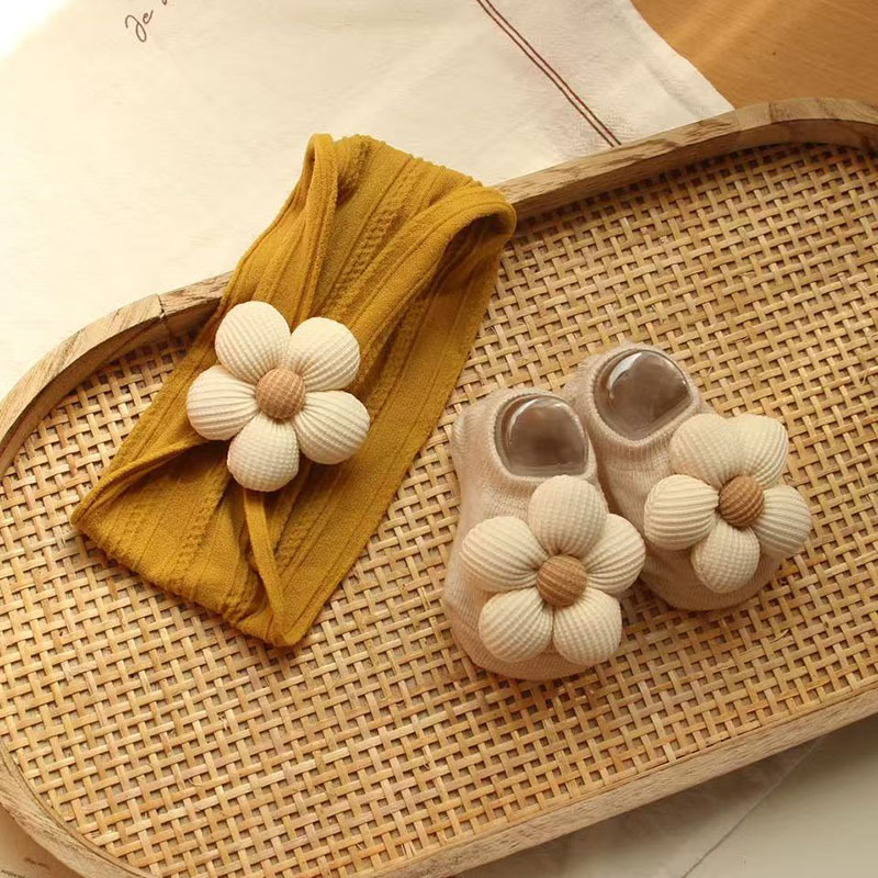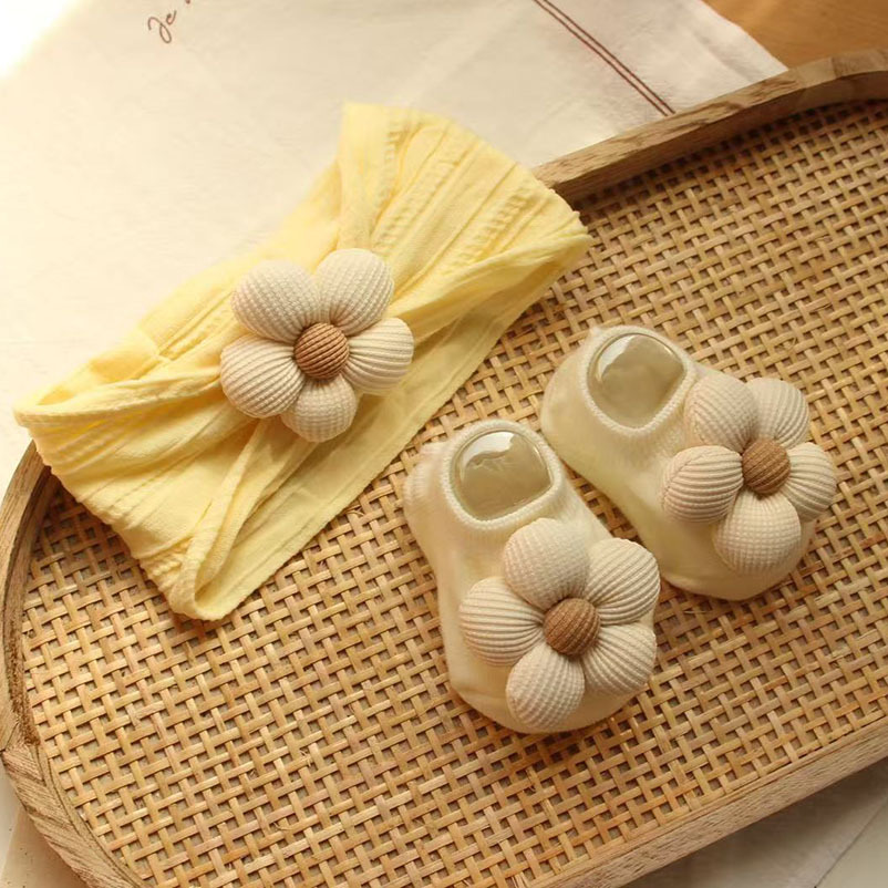 light yellow jacquard hair band + beige flowers + beige ankle socks