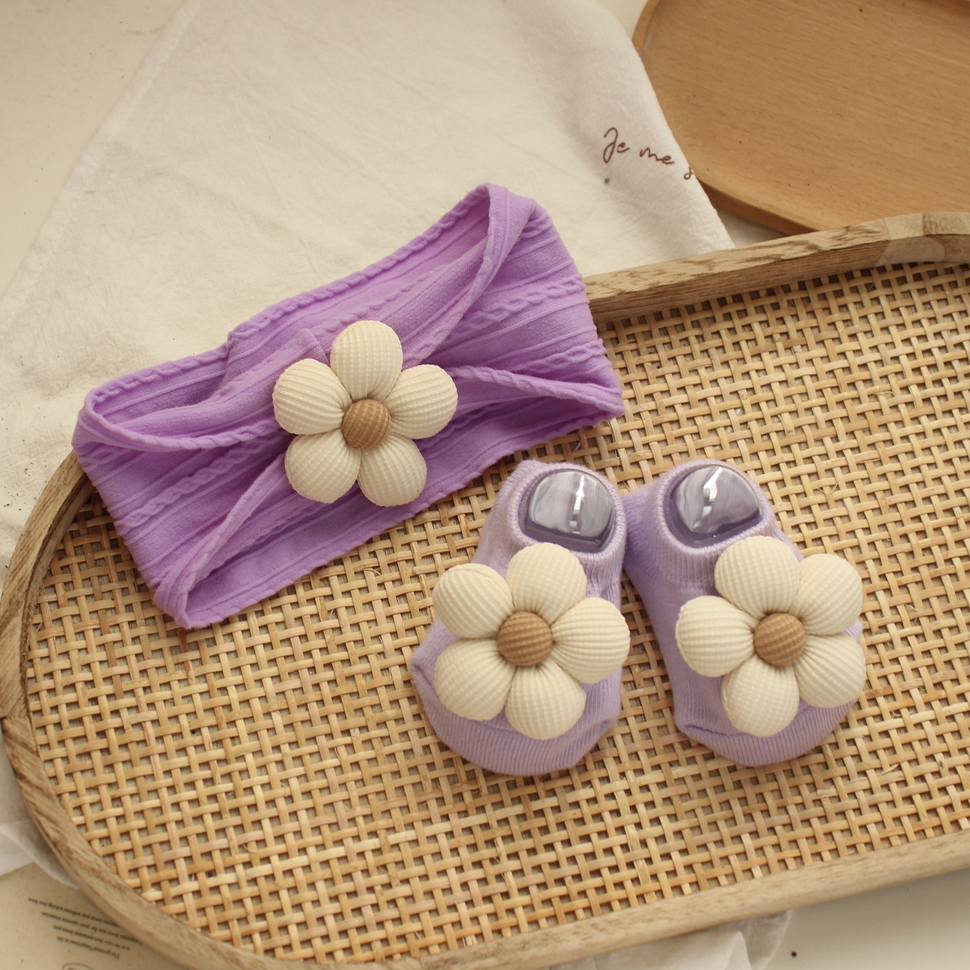 purple jacquard hair band-beige flowers + purple ankle socks