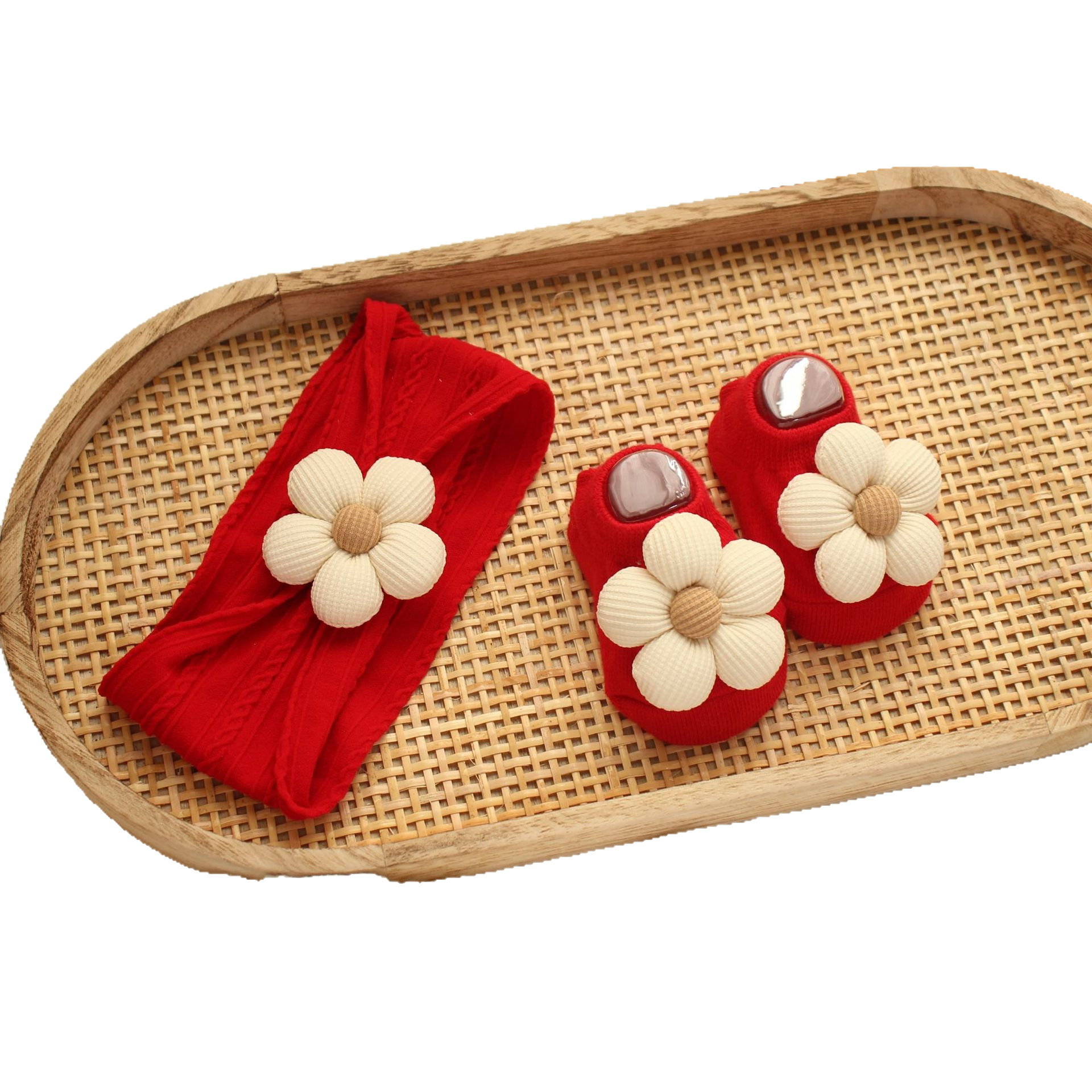 red jacquard hair band-beige flowers + red ankle socks