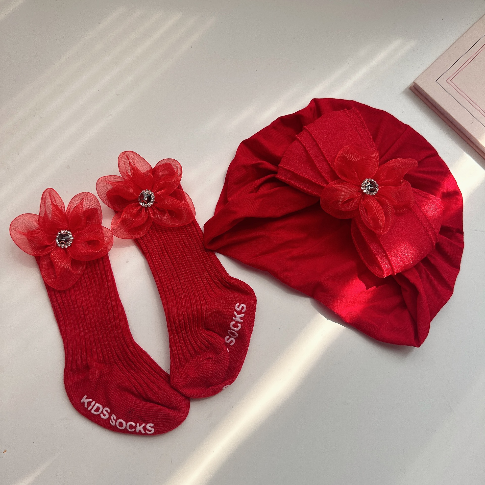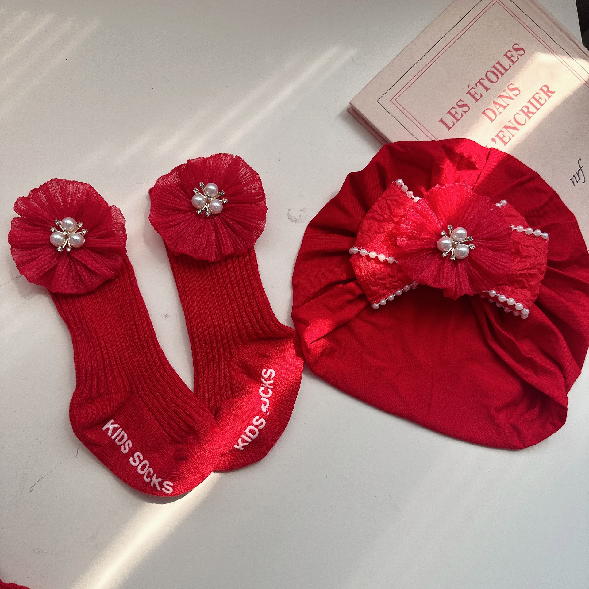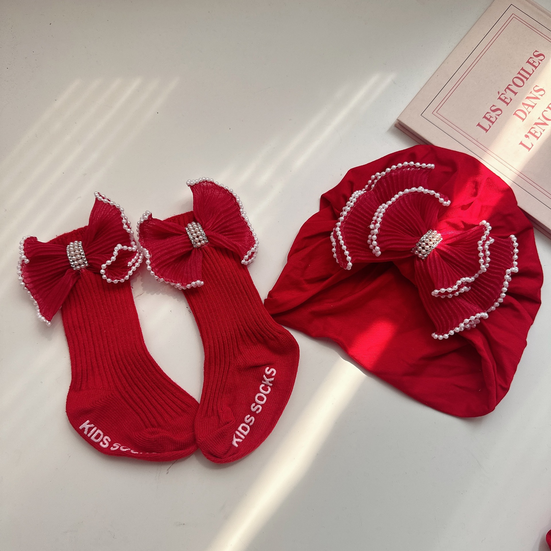83 thin double red pleated hat + long socks