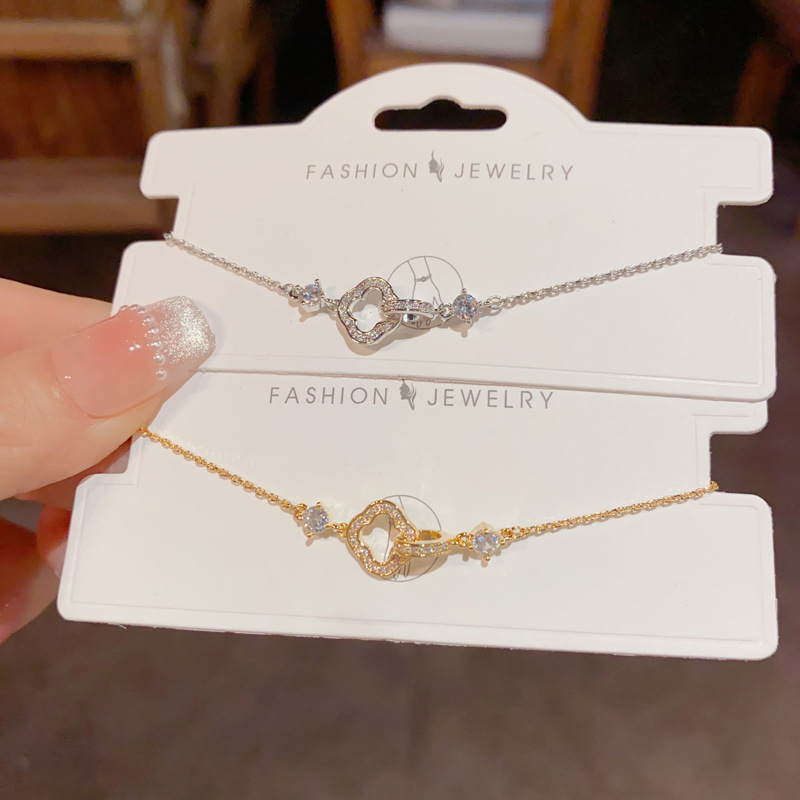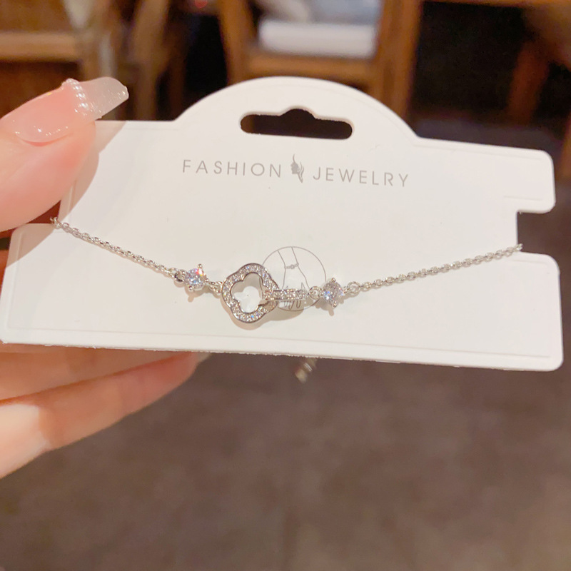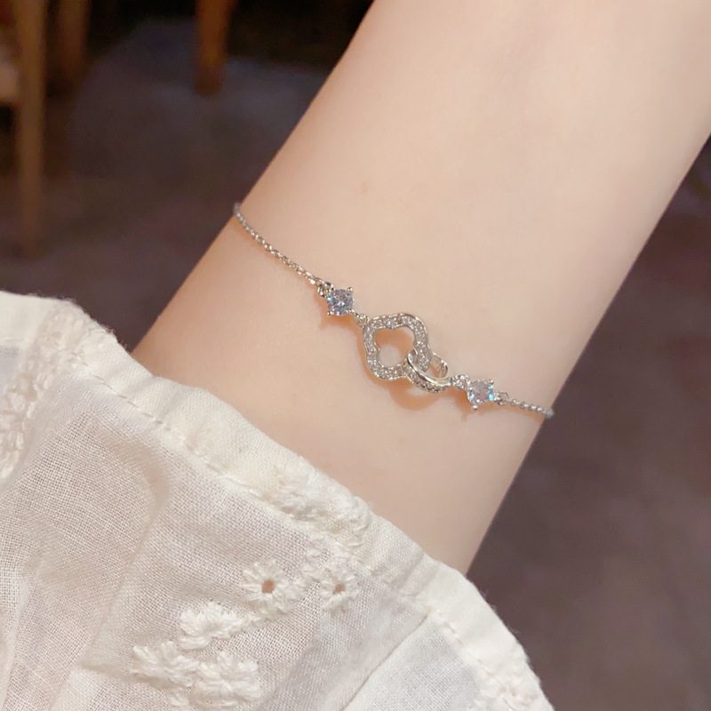 silver-zircon four-leaf clover charm bracelet (thick real gold plating)