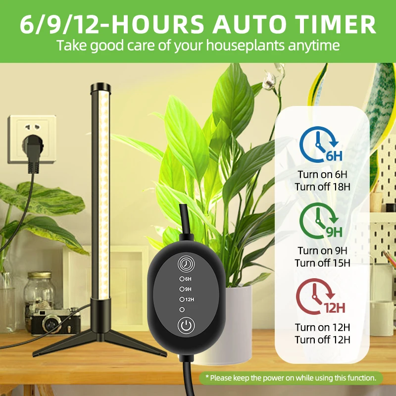 6H/9H/12H Auto-timer: This grow light lamp for indoor plants supports the unique auto-timer function. Once you set the plants lights to stay on for 3H/6H/9H, it will turn off after the settled duration and then turn on again at the same time next day automatically. Thus it will take good care of your plants even if you're away from home on travel or business trip. (Note: Please keep the power on while using this function.)