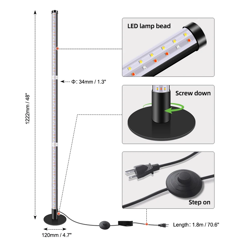 Side Illumination: This floor grow light is designed to stand vertically and provide side illumination, ensuring plants receive sufficient lighting that other traditional grow lamps cannot achieve Wide Illumination Area: The specific upright design of the plant stand provides a wide illumination coverage area to grow large, tall houseplants such as tropical plants, foliage plants, ornamental plants, bonsai trees, and miniature gardens etc Foot Switch: allowing you to turn on the grow lamp without the need to bend over, making it more convenient to use Easy Assembly: The standing grow light features a simple construction that makes it easy to assemble without any tools.