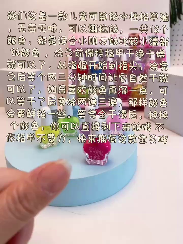 卡通水性指甲油,安全不伤甲。快干持久,色彩鲜艳不脱落,轻松DIY卡通图案。