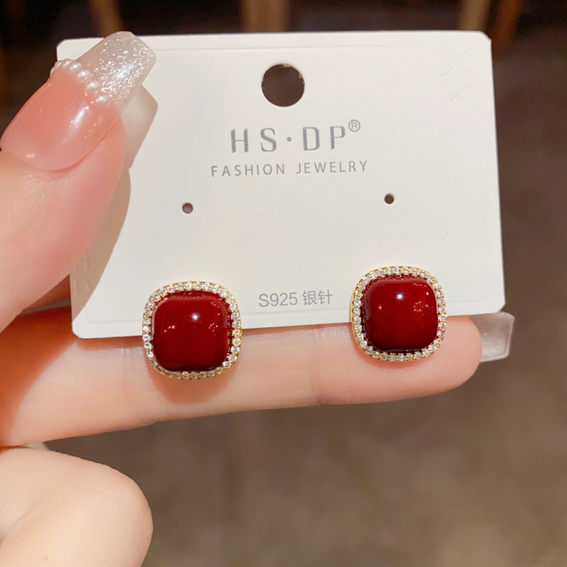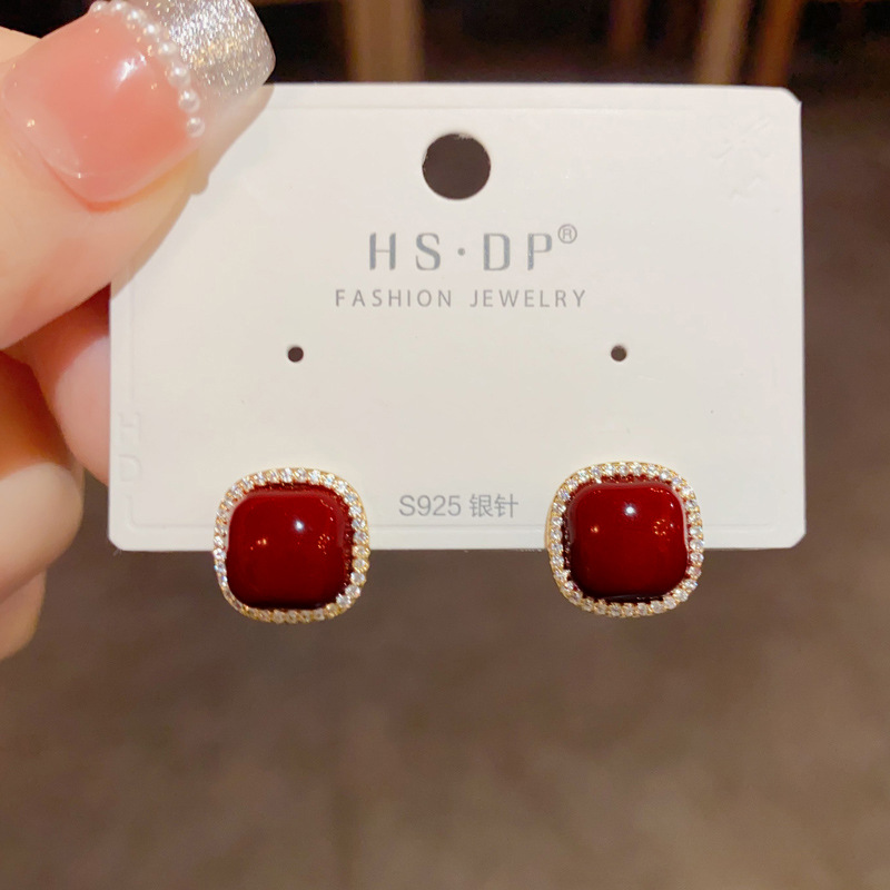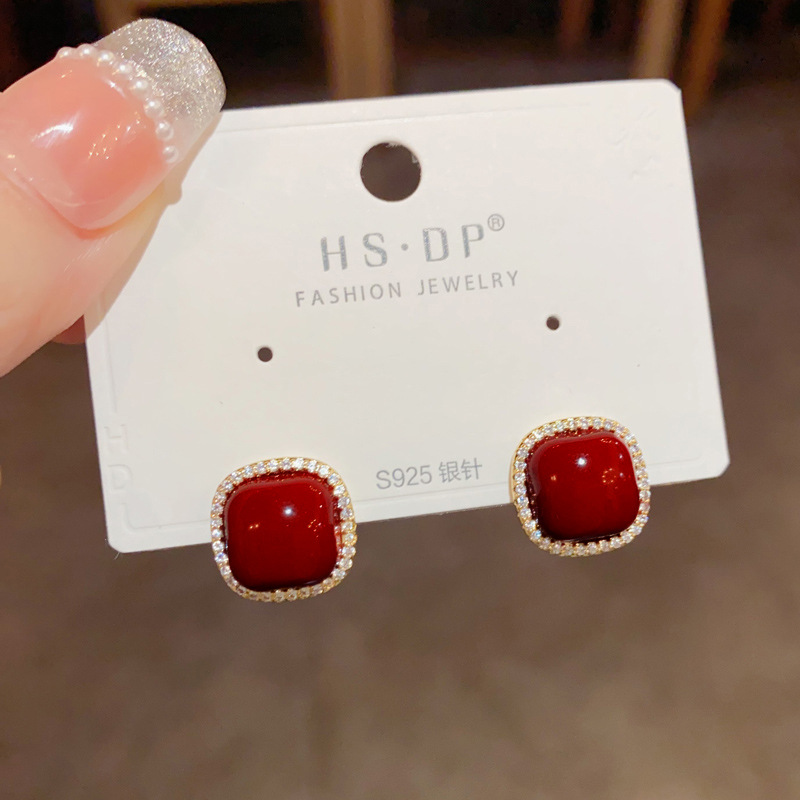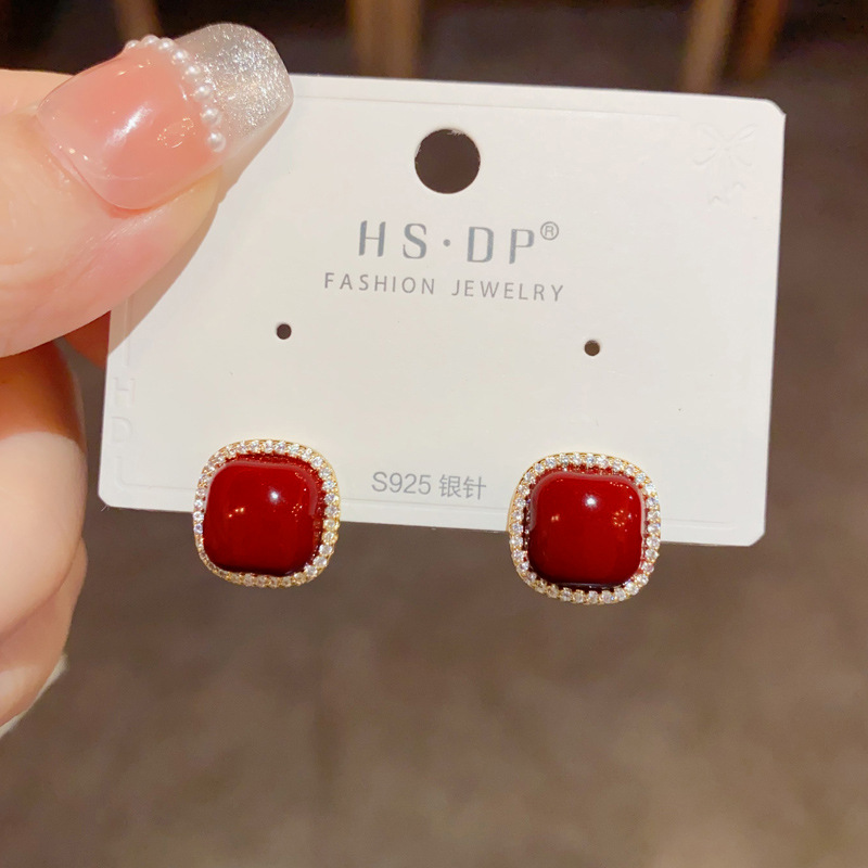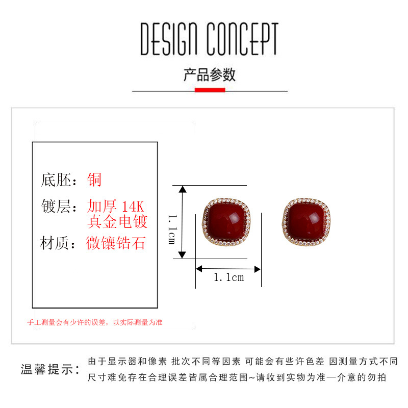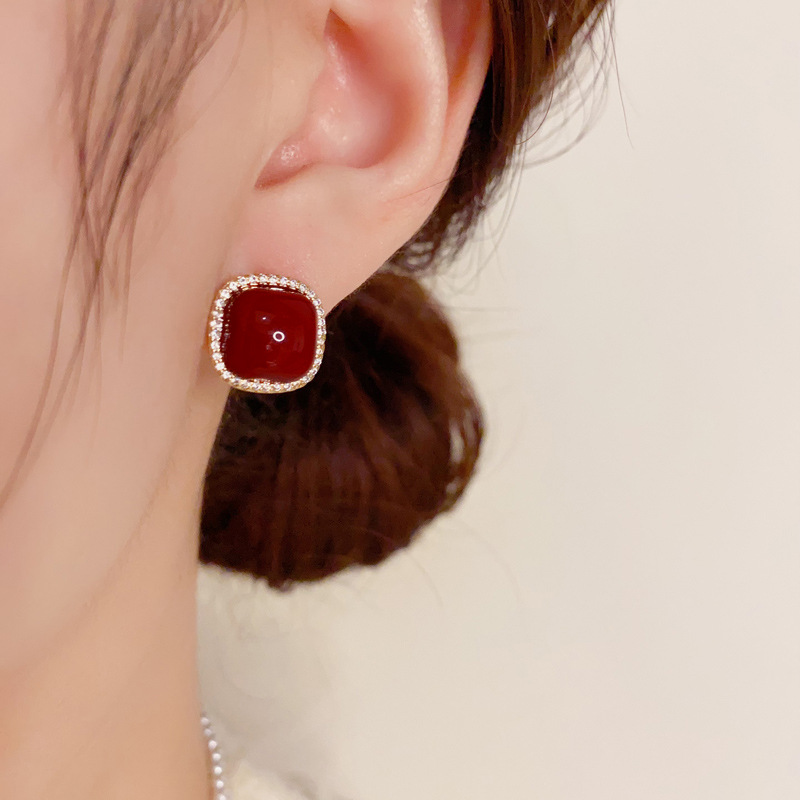 zircon ankela red square pearl stud earrings (thick gold plating)