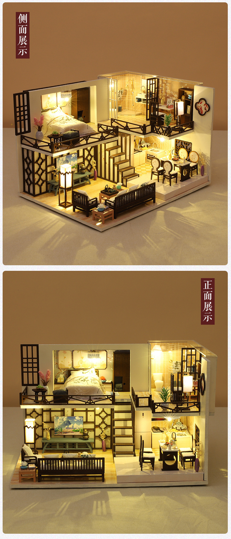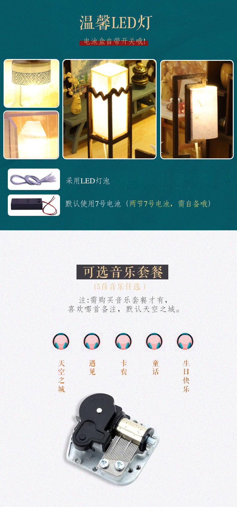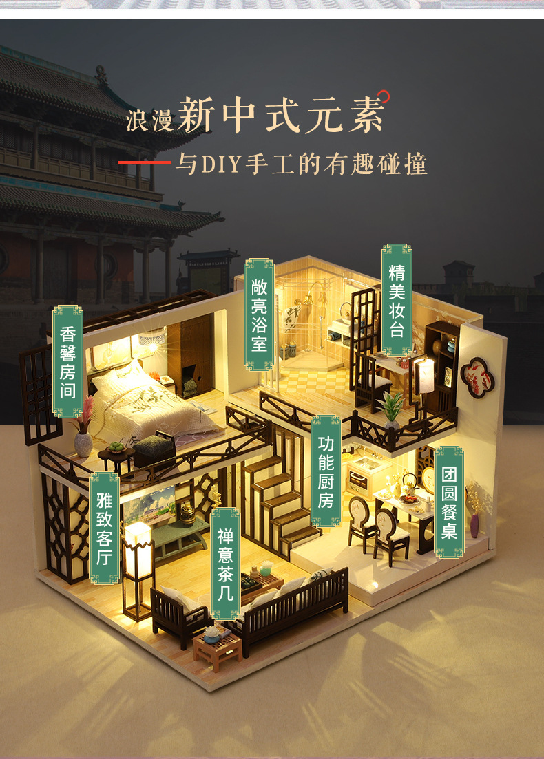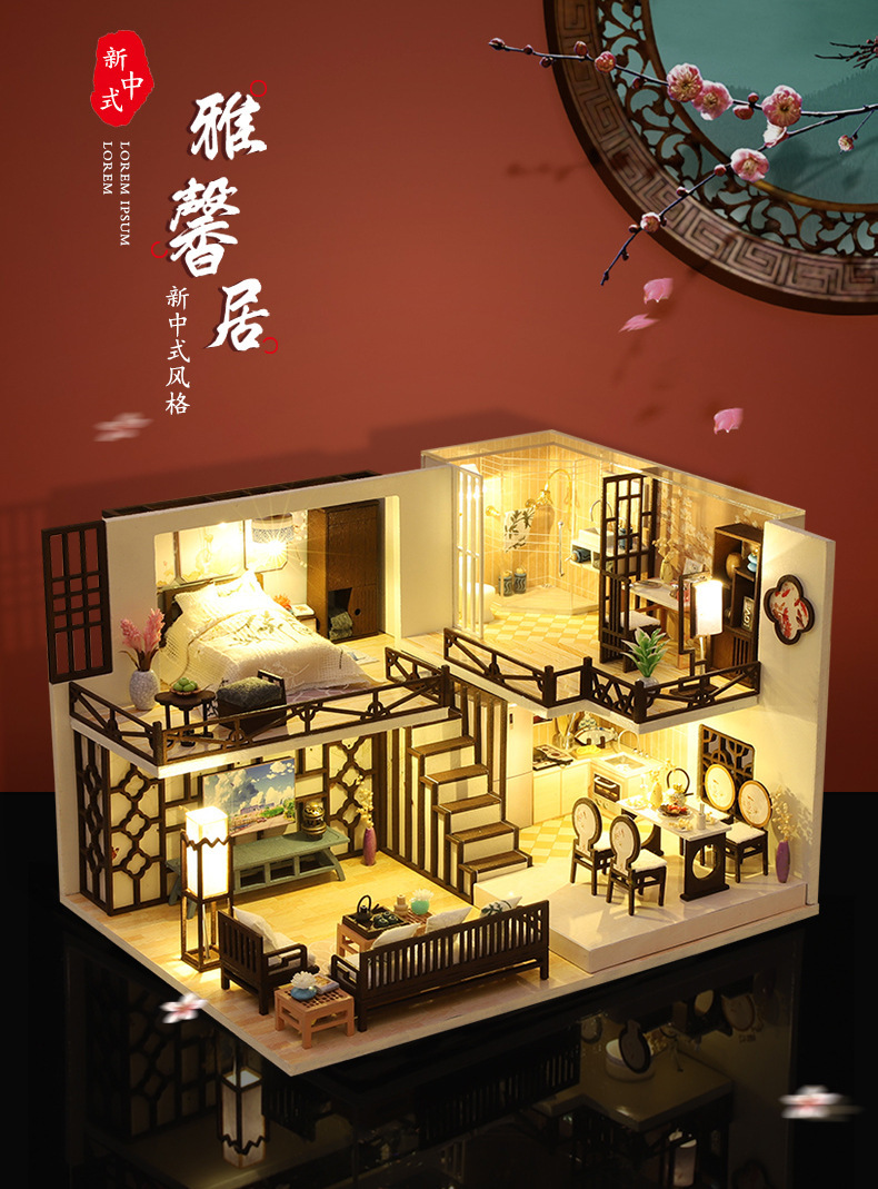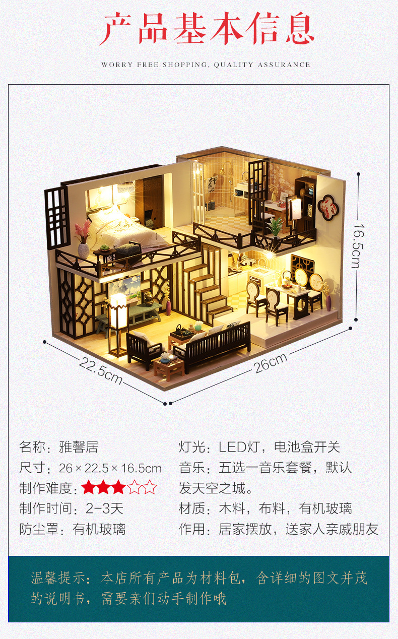 Product Information: M-033-B Yaxinju (with cover) Weight per unit: 1.2KG Box contains 20 pieces Dimensions of finished product: 26*19*16.5CM Dimensions of box: 32*7.5*21CM Packaging dimensions: 66*39*44CM Standard accessories: Material pack, full-color instruction manual, battery box switch, light, one tube of white glue (dust cover and mechanism are optional) Note:This model uses a large movement.