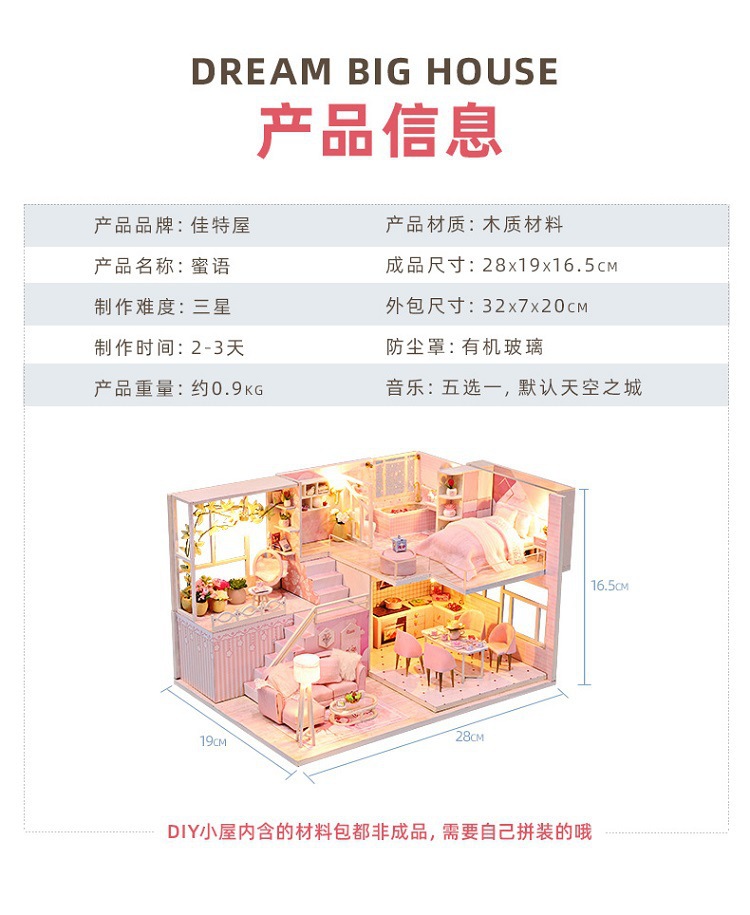 Product Information: M-035-B Sweet Words (with cover) Weight per unit: 1.25KG Box dimensions: 32*7.5*21CM One box contains 20 units Product dimensions: 26*19*16.5CM Packaging dimensions: 66*39*44CM Standard accessories: Material pack, full-color instruction manual, battery box switch, light, one tube of white glue (dust cover and mechanism are optional) Note: This model uses a large movement, with a variety of movements to choose from. There are 5 types of music available, please contact the customer service for more details.