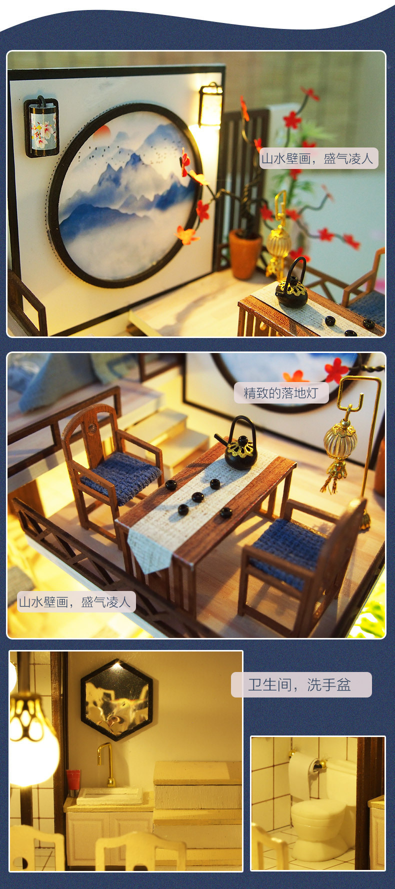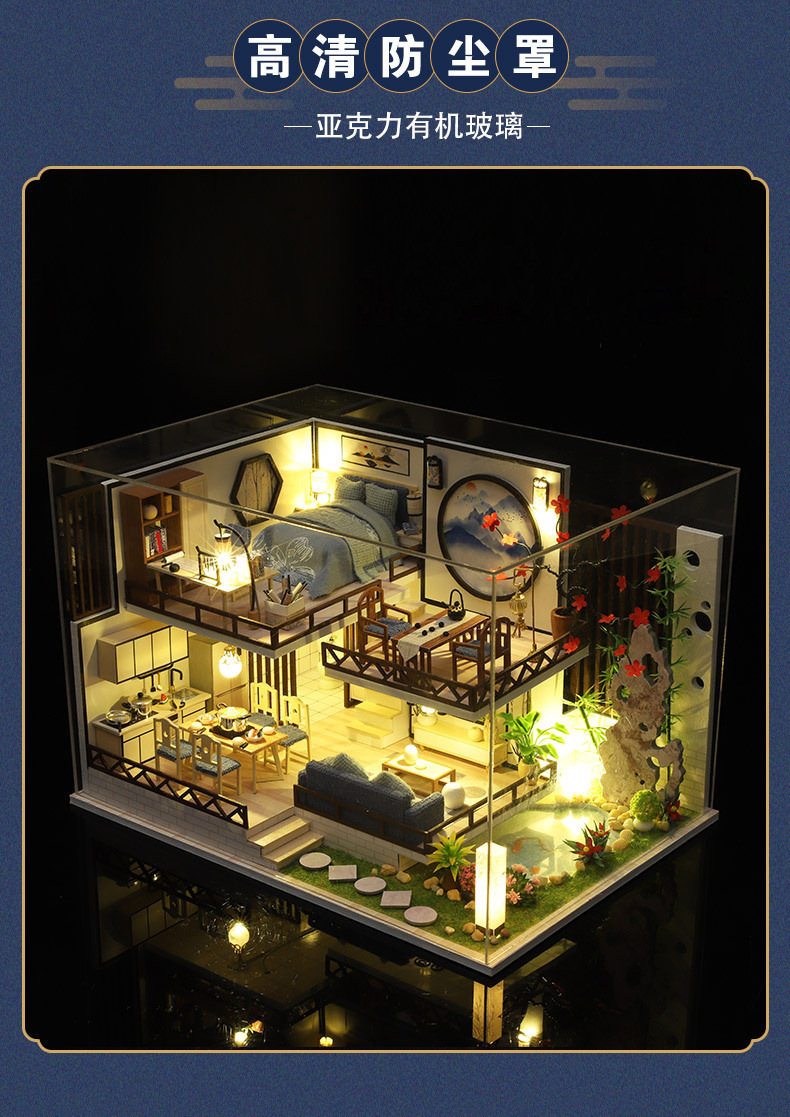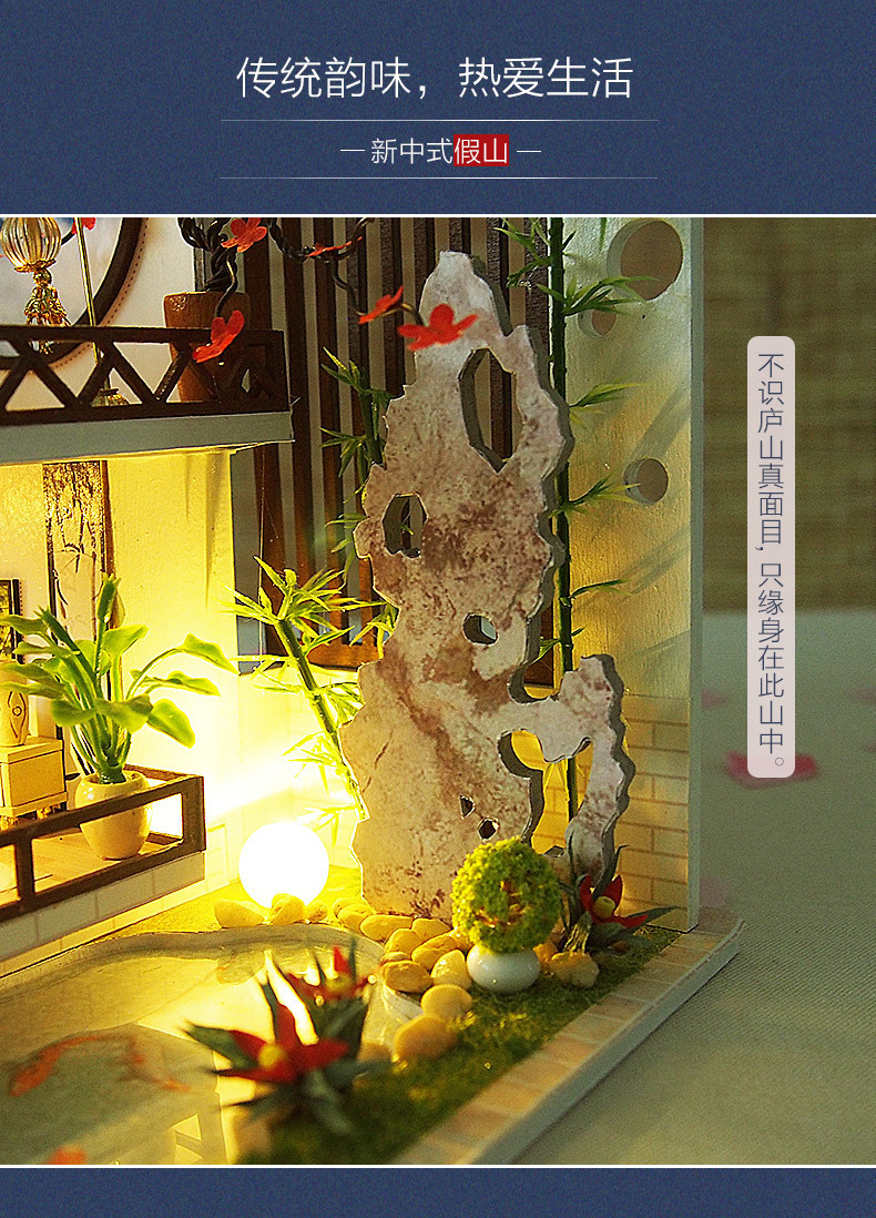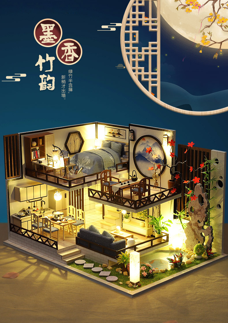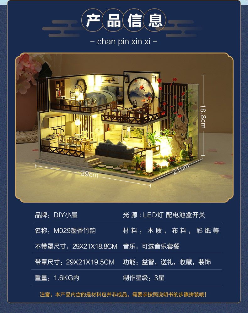 Product Information: M-029-2 Ink and Bamboo Charm (with cover) Weight per unit: 1.6KG Box contains 16 pieces Product box dimensions: 32*7.5*24.5CM Finished product dimensions: 29*21*19.5CM Packaging dimensions: 66*39*44CM Standard equipment: Material package, full-color instruction manual, battery box switch, light, one tube of white glue, dust cover (mechanism is optional) Note:This model uses a large movement.