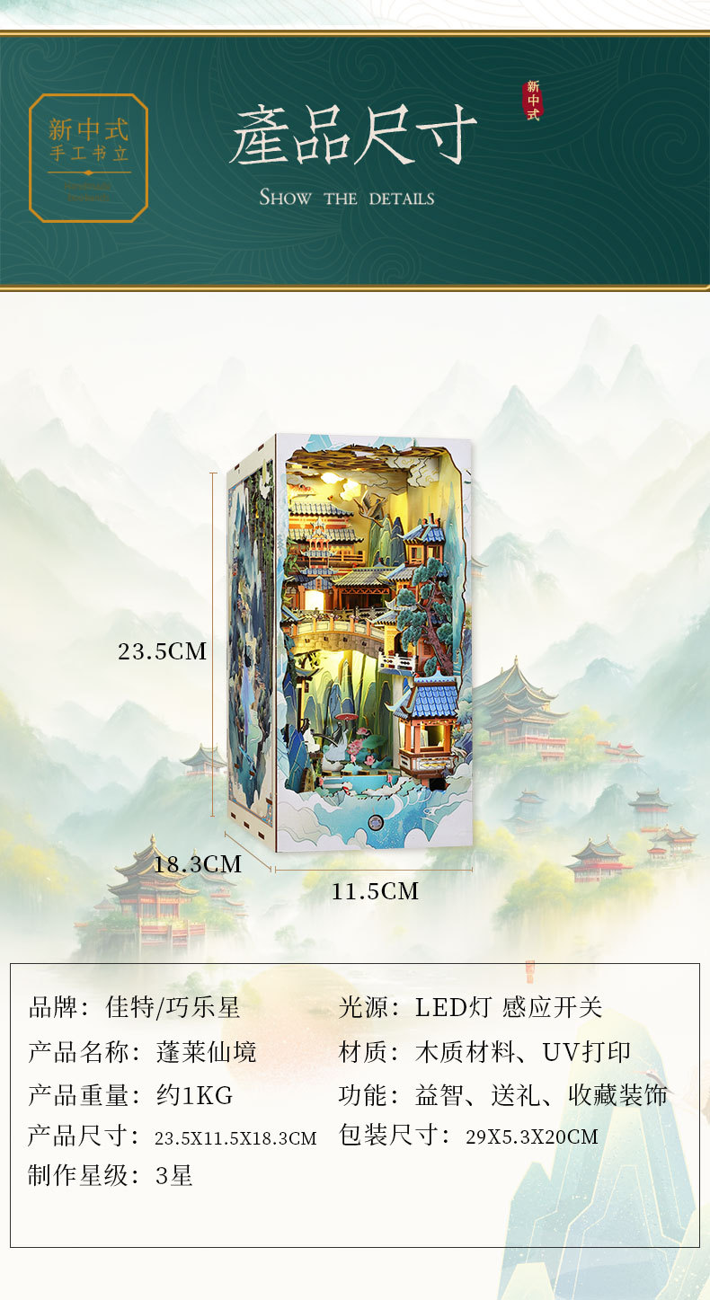 商品基本信息:SL15-A蓬莱仙境(小机芯需另购) 单个重量1.26KG一箱24个产品盒装尺寸:29*5.3*20CM成品尺寸:18.3*11.5*23.5CM