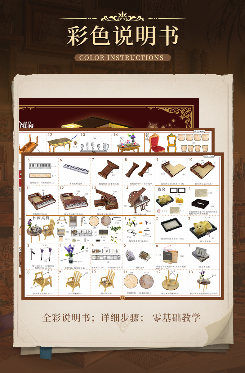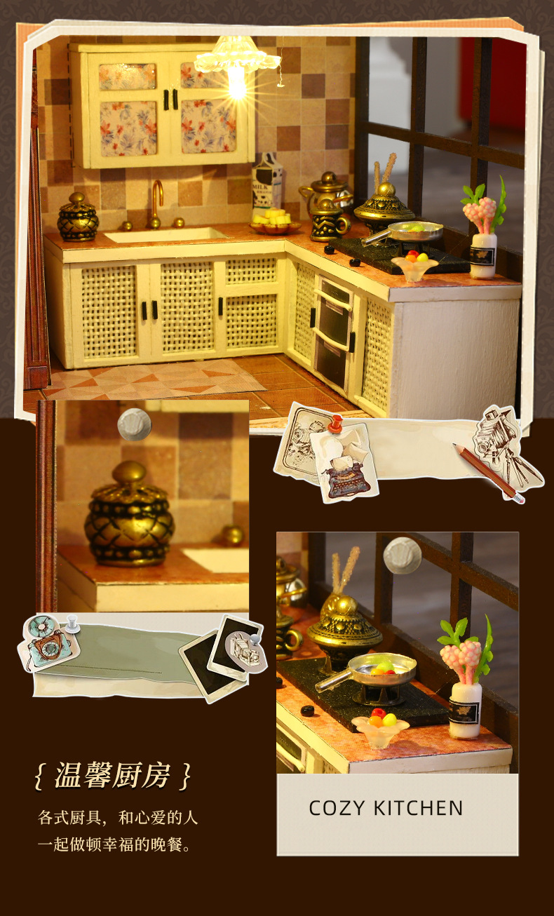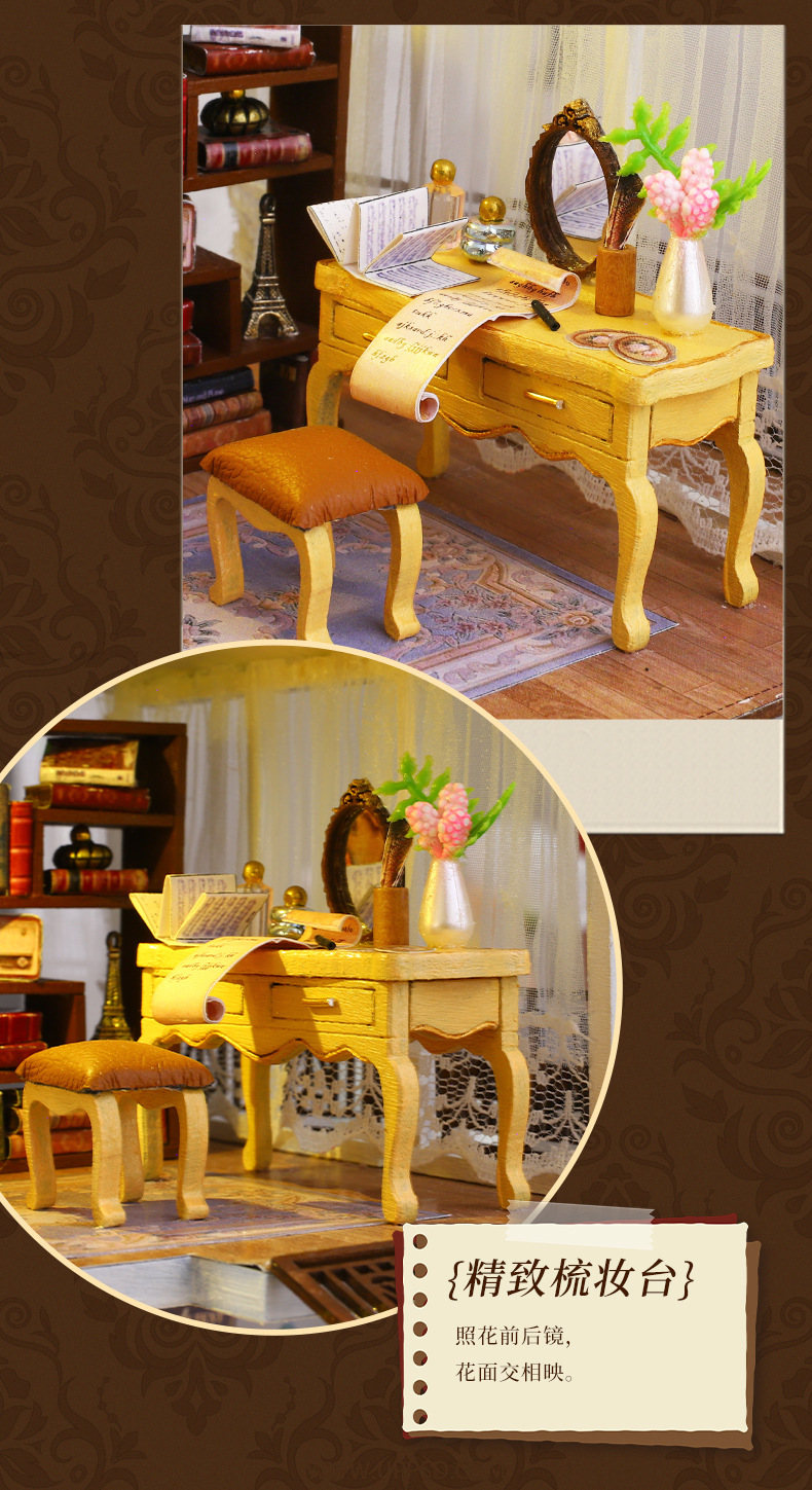 所有DIY小屋产品均为材料包,非成品,需要配合工具(镊子,直尺,小刀,螺丝刀,剪刀等)和快速胶水(U胶或酒精胶)制作才能完成,制作完成以后就是图片效果,批发均为原包装,不带工具和胶水,如果需要订购请移步至店铺工具配件分类项选购!