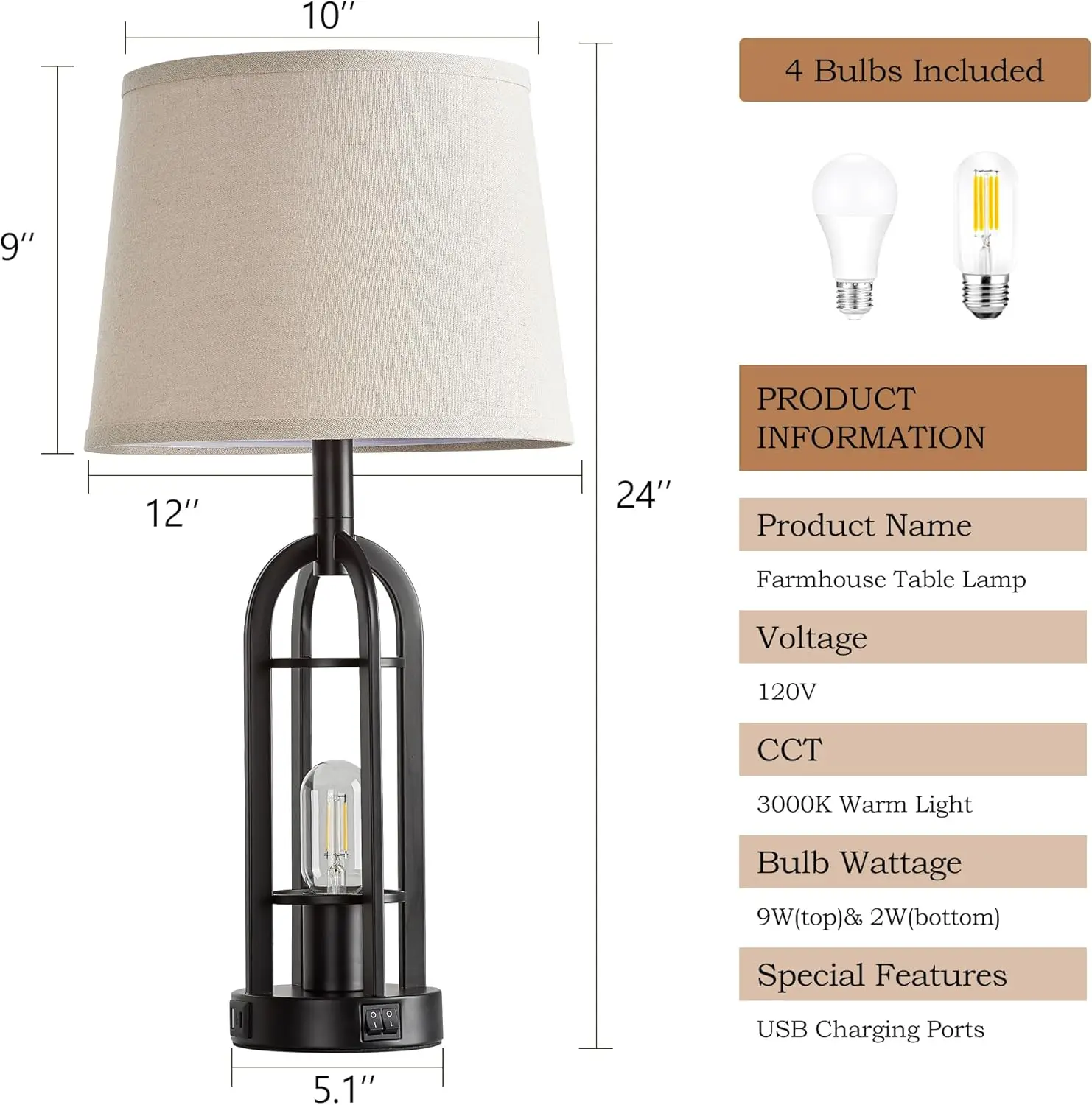 USB A + C卧室60.96厘米黑色现代台灯客厅发光二极管触摸控制E26灯泡底座2年保修台灯
