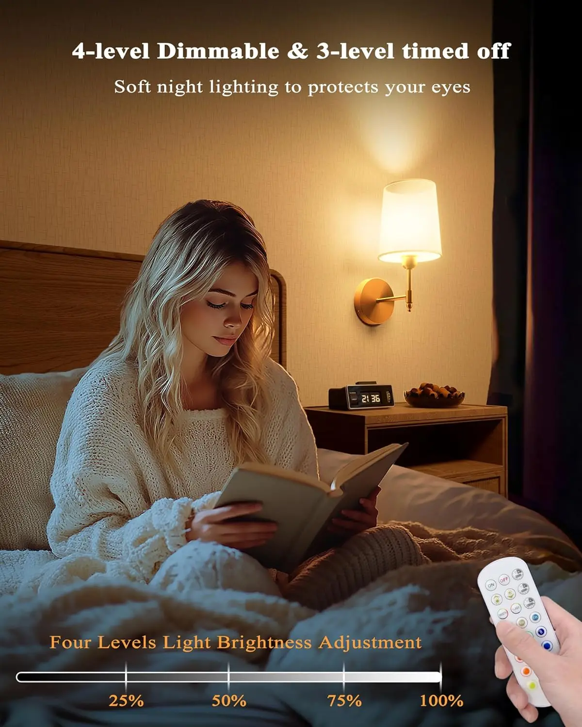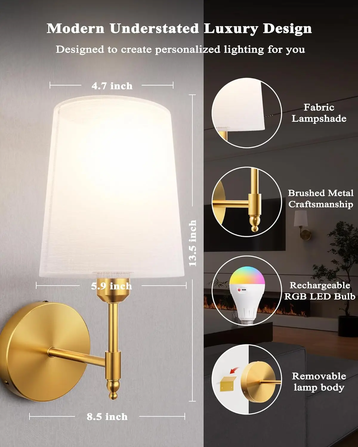 金色电池供电可调光壁灯2件套5600毫安无线充电RGB灯泡卧室客厅遥控器