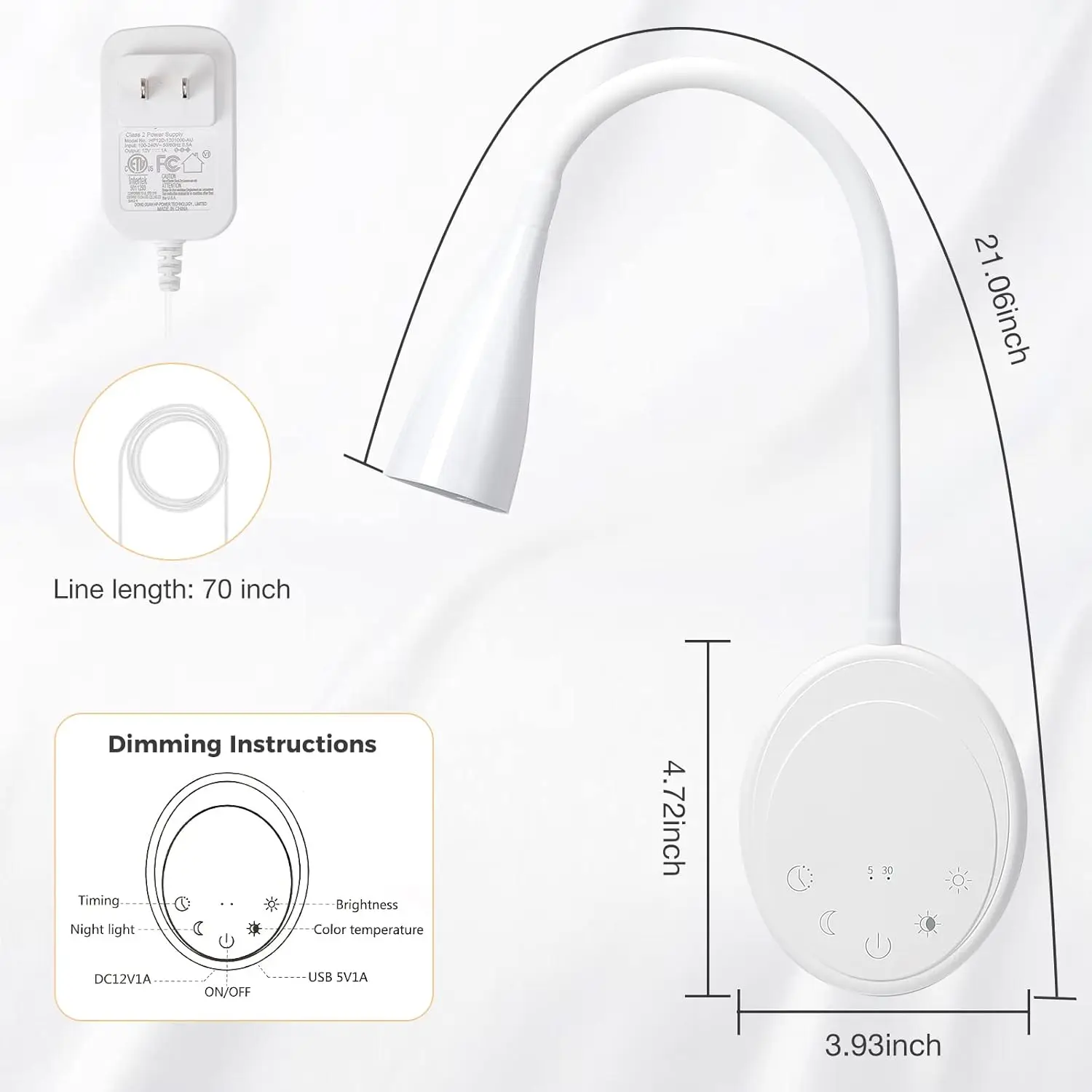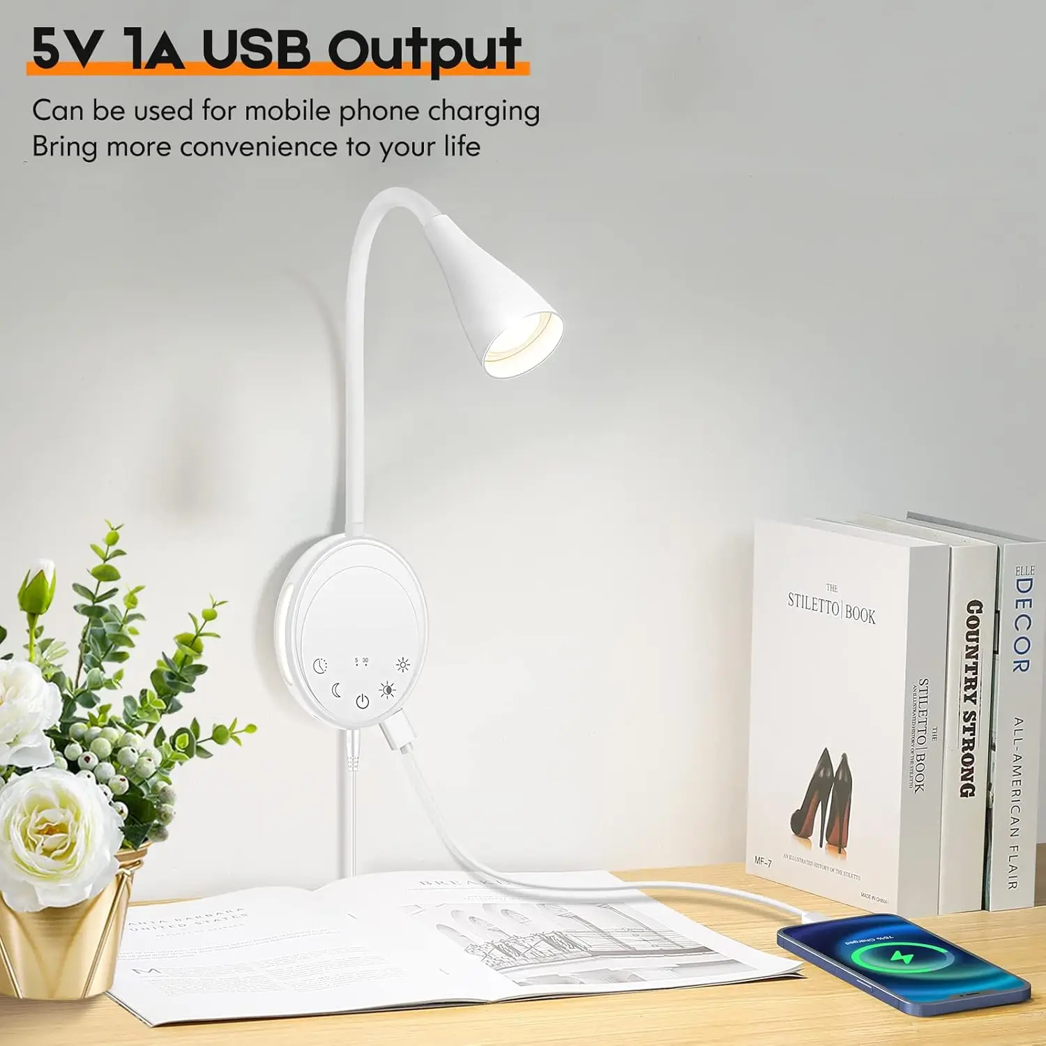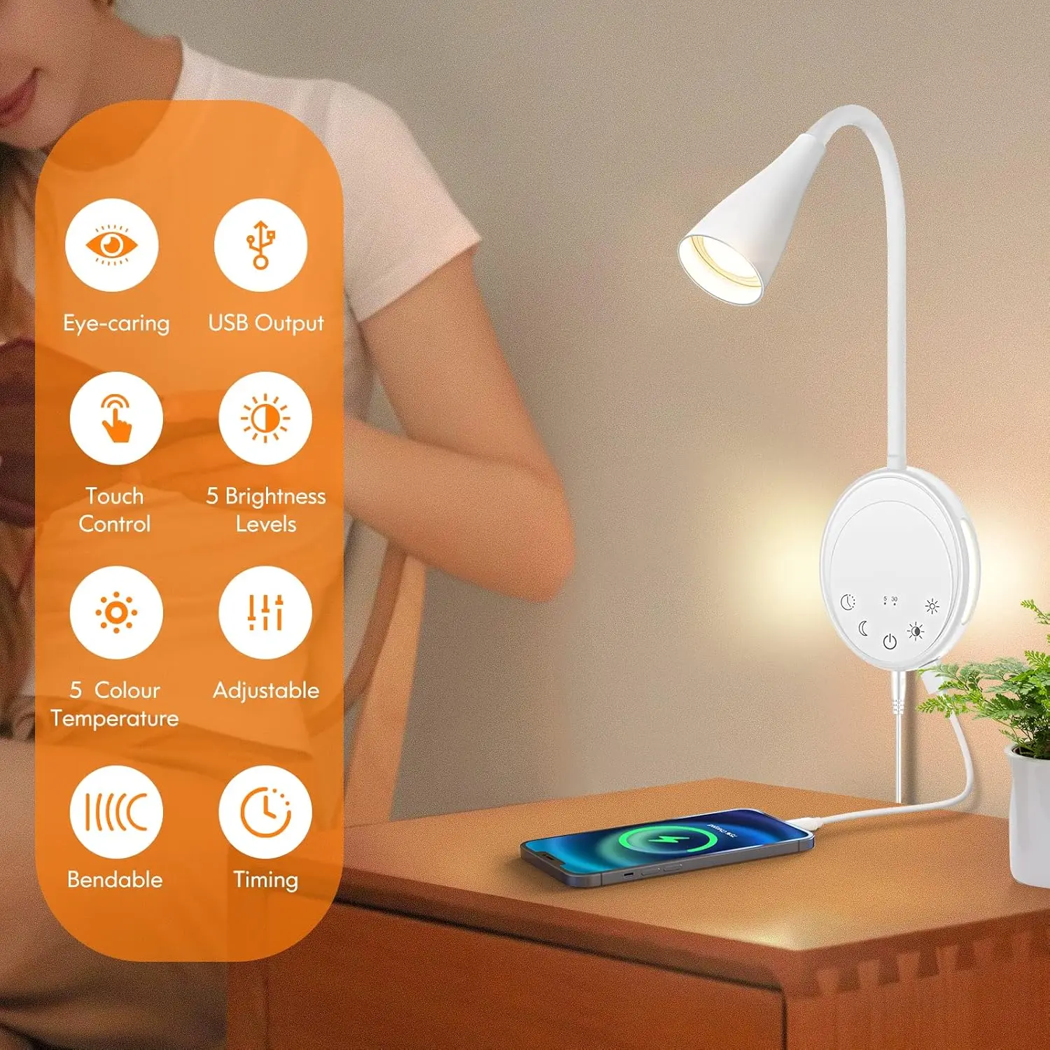 带5个可调白光的USB发光二极管夜灯床阅读和壁挂式柔性鹅颈触摸定时器控制