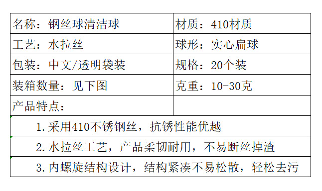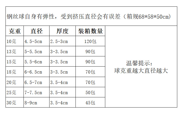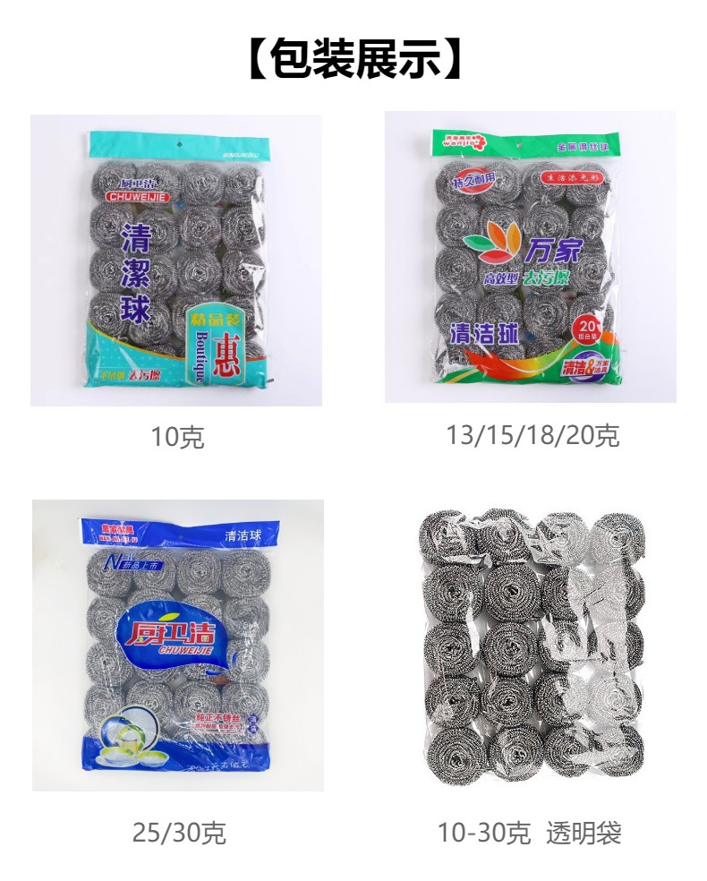2.钢丝球调换克重前期,会有个别球断丝不均匀,且多个包装需要修剪掉球尾避免粘连,导致克重误差±1-2克左右,不属于质量问题。(如因正常误差范围内克重偏差要求退换货,请恕我们不予处理)